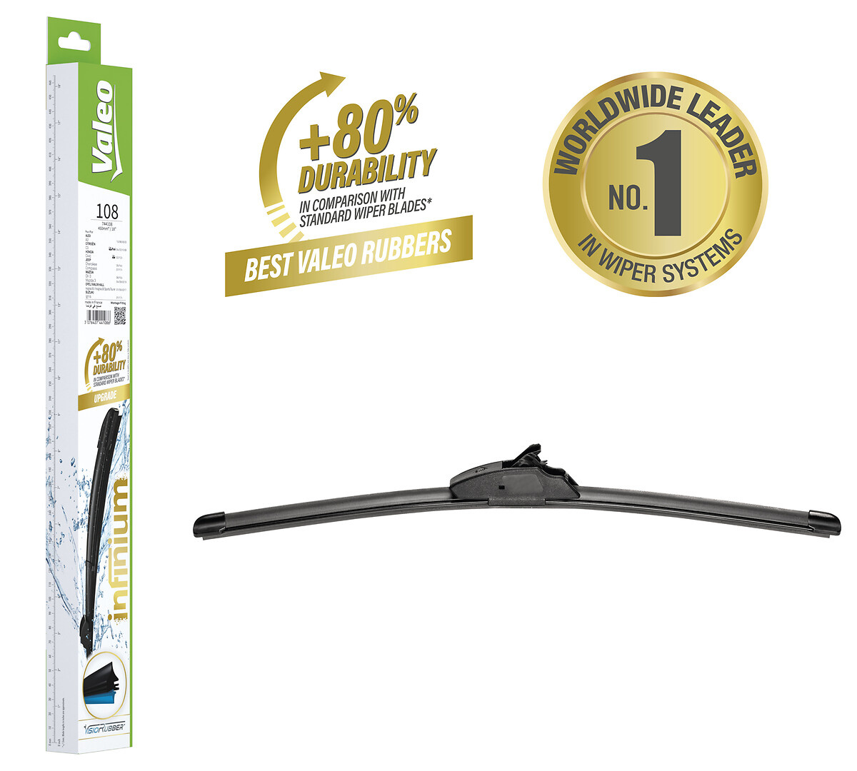 "Les balais d'essuie-glace Valeo Infinium assurent une durabilité d'essuyage accrue pour un maintient de la performance dans le temps. Valeo a développé et utilisé ses meilleurs caoutchoucs afin d'offrir une excellente qualité d'essuyage et garantir : - Une durabilité améliorée sous toutes conditions climatiques - Une performance optimisée"