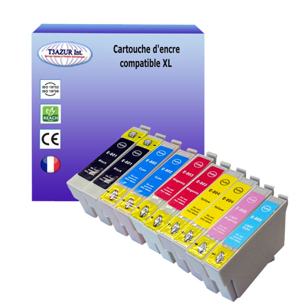 Remplacent les cartouches d'encre Epson T0801 / T0802 / T0803 / T0804 / T0805 / T0806 - Compatible avec l'imprimante Epson Stylus Photo P50, PX650, PX660, PX700W, PX710W, PX720WD, PX730WD, PX800FW, PX810FW, PX820FWD, PX830FWD, R217, R265, R276, R285, R360, R585, R685, RX560, RX585, RX685 - Ce lot comprend: 2 Noires (17ml) + 2 Cyan (17ml)) + 2 Magenta (17ml) + 2 Jaunes (17ml) + Light Magenta (17ml) + Light Cyan (17ml) avec un rendement de 5% , repondent à toutes les normes européennes ISO 9001/14001, STMC, CE, ROHS - 100% Compatible - Encre de haute qualité qui garantie une excellence qualité d'impression - Marque T3AZUR