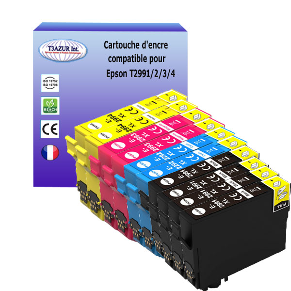 Remplacent les cartouches d'encre Epson T2991 / T2992 / T2993 / T2994 (29XL) - Compatible avec l'imprimante Epson Expression Home XP-235, XP-245, XP-247, XP-255, XP-257, XP-332, XP-335, XP-342, XP-345, XP-352, XP-355, XP-432, XP-435, XP-442, XP-445, XP-452, XP-455- Ce lot comprend: 4 Noires (17ml) + 2 Cyan (13ml) + 2 Magenta (13ml) + 2 Jaunes (13ml) avec un rendement de 5% , repondent à toutes les normes européennes ISO 9001/14001, STMC, CE, ROHS - 100% Compatible - Encre de haute qualité qui garantie une excellence qualité d'impression - Marque T3AZUR