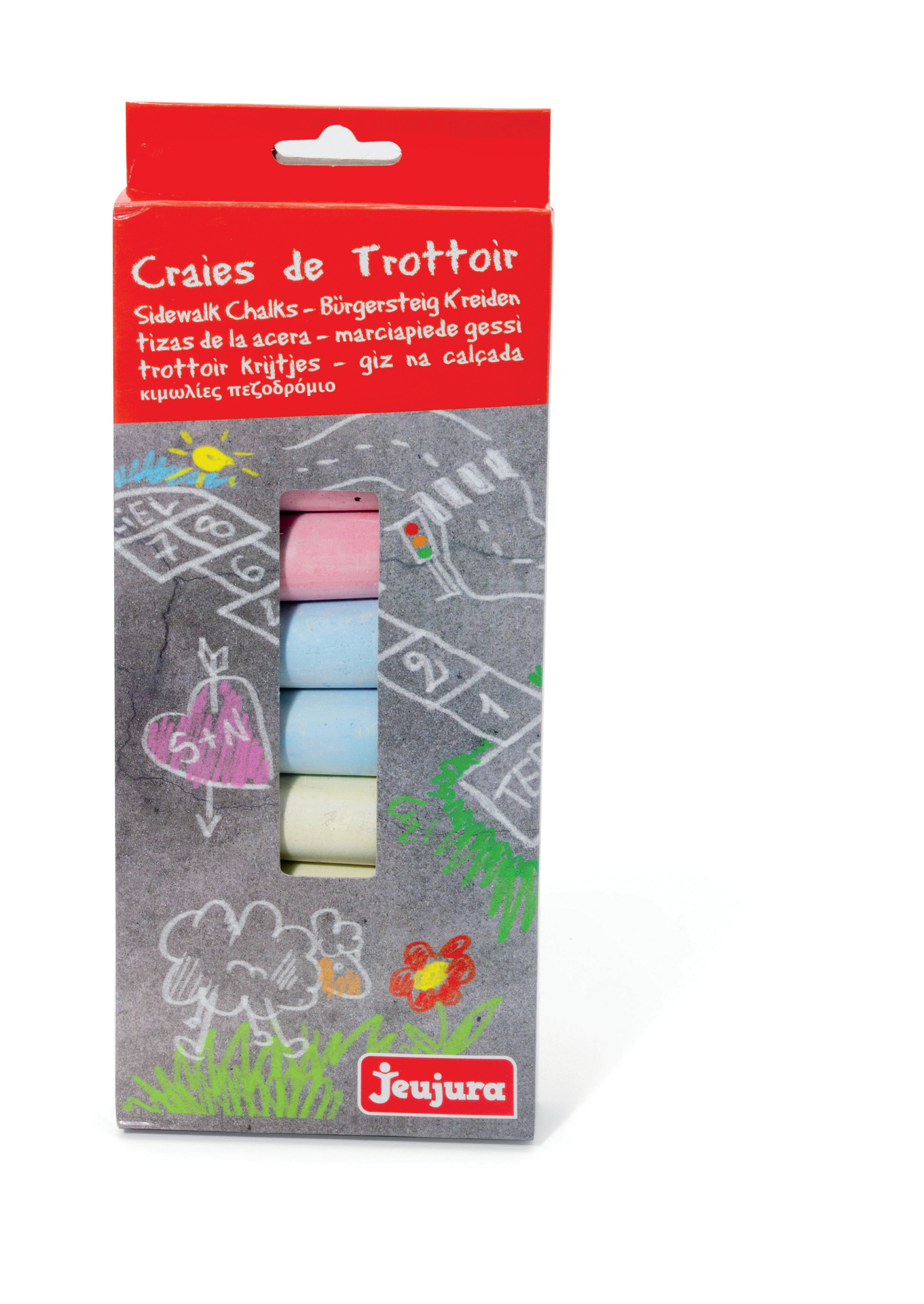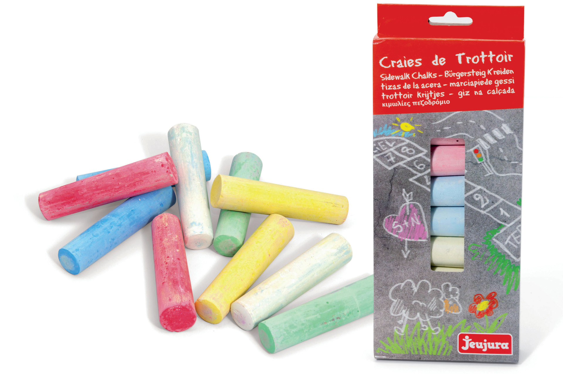 Craies de Trottoir : étui de 10 grosses craies de trottoir. Idéales pour dessiner sur le sol, ces craies serviront à faire les plus beaux dessins et de très jolies marelles toutes en couleur. Dimensions d’une craie : 10 cm – diam : 2.5 cm. Dimensions du produit : 11 x 27 x 2,5 cm. A partir de 3 ans.