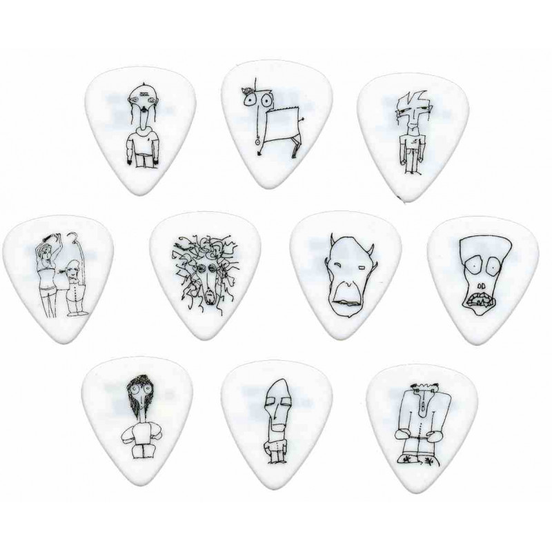 Les 10 dessins sur ces médiators ont été reproduits directement à partir du carnet d'esquisses personnel de Joe Satriani. Les médiators JS sont en celluloïd de première qualité et sont disponibles en blanc à impression noire ou en noir à impression blanche (chaque pack comprend 10 exemplaires de dessins JS différents).