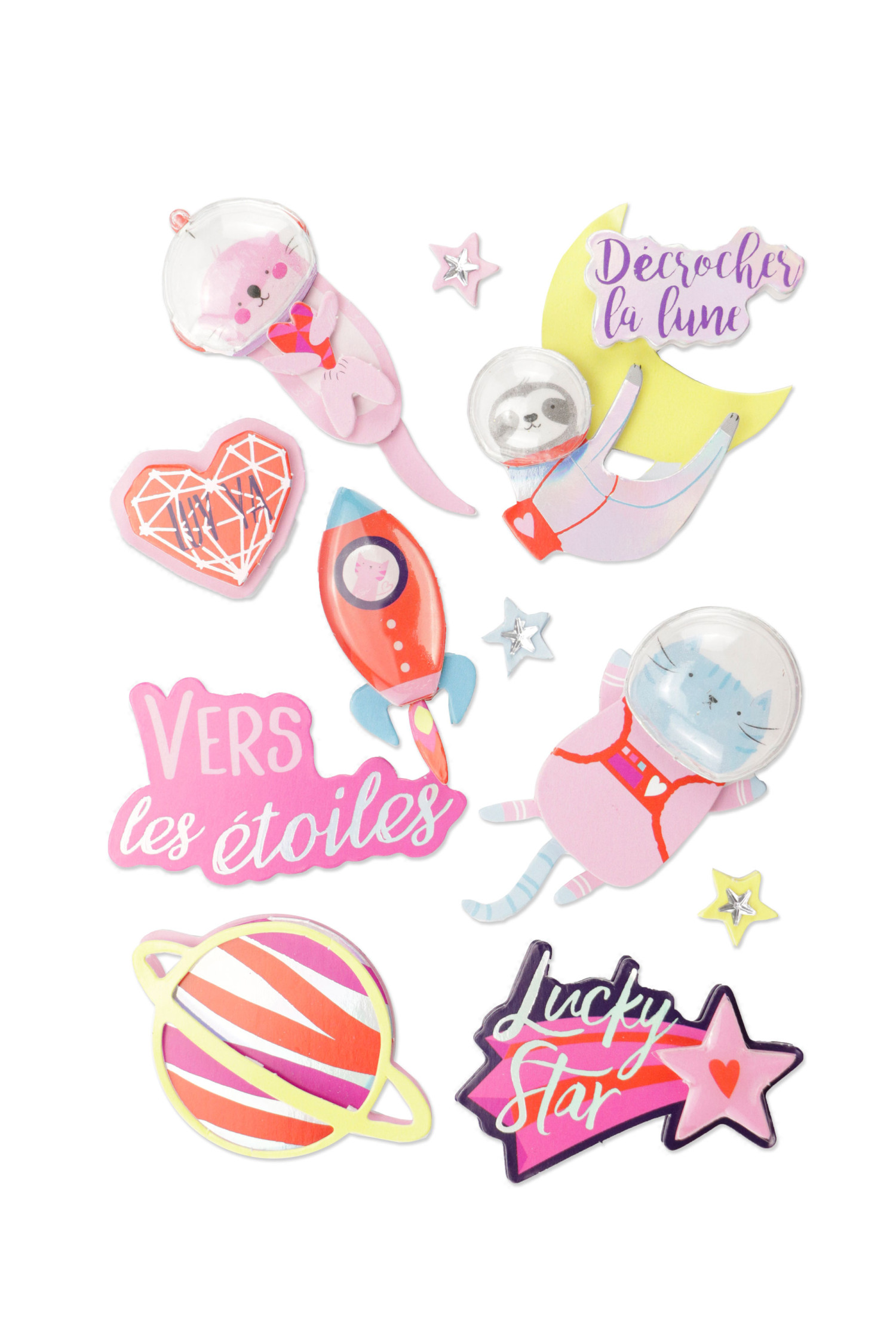 Planche de 10 stickers en 3D Galaxie. A coller sur tous vos projets de scrapbooking, vos cartes de vœux de fin d'année, vos faire-part et toutes vos idées de DIY. En papier cartonné et en relief, ces stickers originaux mettent bien en valeurs leurs motifs. Ici, plusieurs animaux (chat, paresseux, marmotte) sont mis en scène dans l'univers, avec des fusées, la lune, un costume d'astronaute, dans des couleurs rouge-rose. Dimensions par sticker : 5 cm environ.