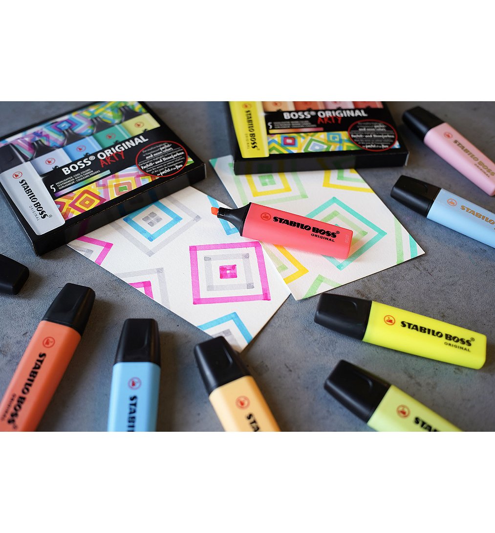 Avec ses 23 couleurs, STABILO BOSS ORIGINAL devient un véritable instrument de création sur papier, pour dessiner, colorier ou décorer... Sa pointe biseautée offre 2 largeurs de tracé de 2 et 5 mm qui permet de réaliser des lignes de différentes épaisseurs ou de remplir de grands aplats de couleur. Son encre transparente à base d'eau permet de réaliser des mises en valeur mais également de superposer les couleurs. Ses 9 couleurs fluo et ses 14 teintes pastel apporteront la variété de couleurs nécéssaires à vos réalisations. Son utilisation est parfaite pour vos activités créatives telles que le lettering ou le bullet journal. Un étui de 10 STABILO BOSS ORIGINAL contenant des déclinaisons de bleu, vert, gris et violet en fluo et en pastel pour des créations harmonieuses en coloris froids.