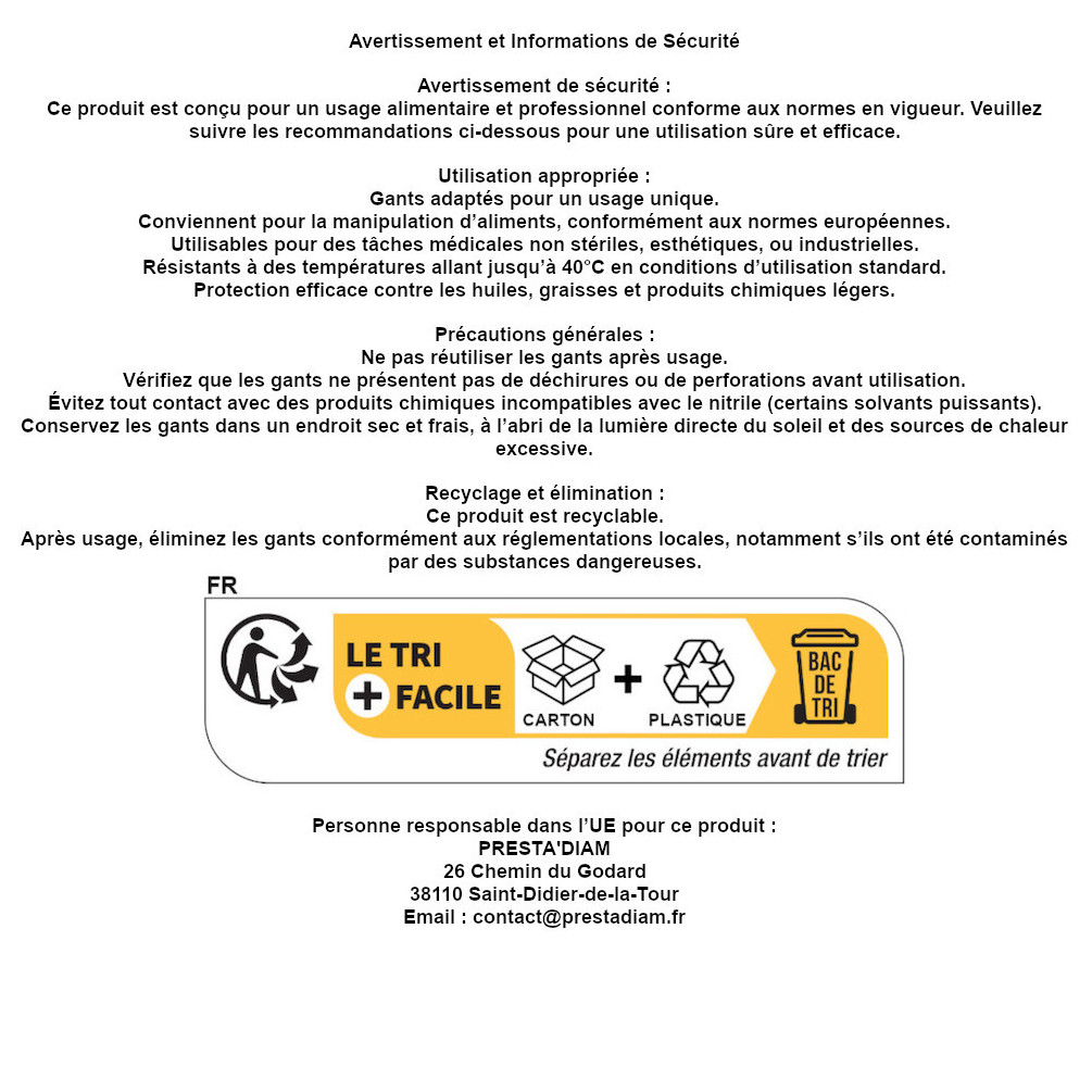Caractéristiques techniques.- Matériau : Nitrile de haute qualité, souple et résistant.