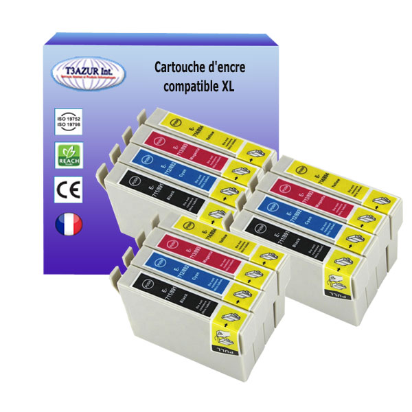 Remplacent les cartouches d'encre Epson T0711 / T0712 / T0712 / T0714 - Compatible avec l'imprimante Epson Stylus CX4300, CX7300, D120, D78, D91, D92, DX4000, DX4050, DX4400, DX4450, DX5000, DX5050, DX6000, DX6050, DX7000F, DX7400, DX7450, DX8400, DX8450, DX9400F, Epson Stylus Office B1100, B40W, BX300F, BX310FN, BX3450F, BX600FW, BX610FW, Epson Stylus S20, S21, SX100, SX105, SX110, SX115, SX200, SX205, SX209, SX210, SX215, SX218, SX400, SX405, SX410, SX415, SX510W, SX515W, SX600FW, SX610FW - Ce lot comprend: 3 Noires (13ml) + 3 Cyan (13ml) + 3 Magenta (13ml) + 3 Jaunes (13ml) avec un rendement de 5% , repondent à toutes les normes européennes ISO 9001/14001, STMC, CE, ROHS - 100% Compatible - Encre de haute qualité qui garantie une excellence qualité d'impression - Marque T3AZUR