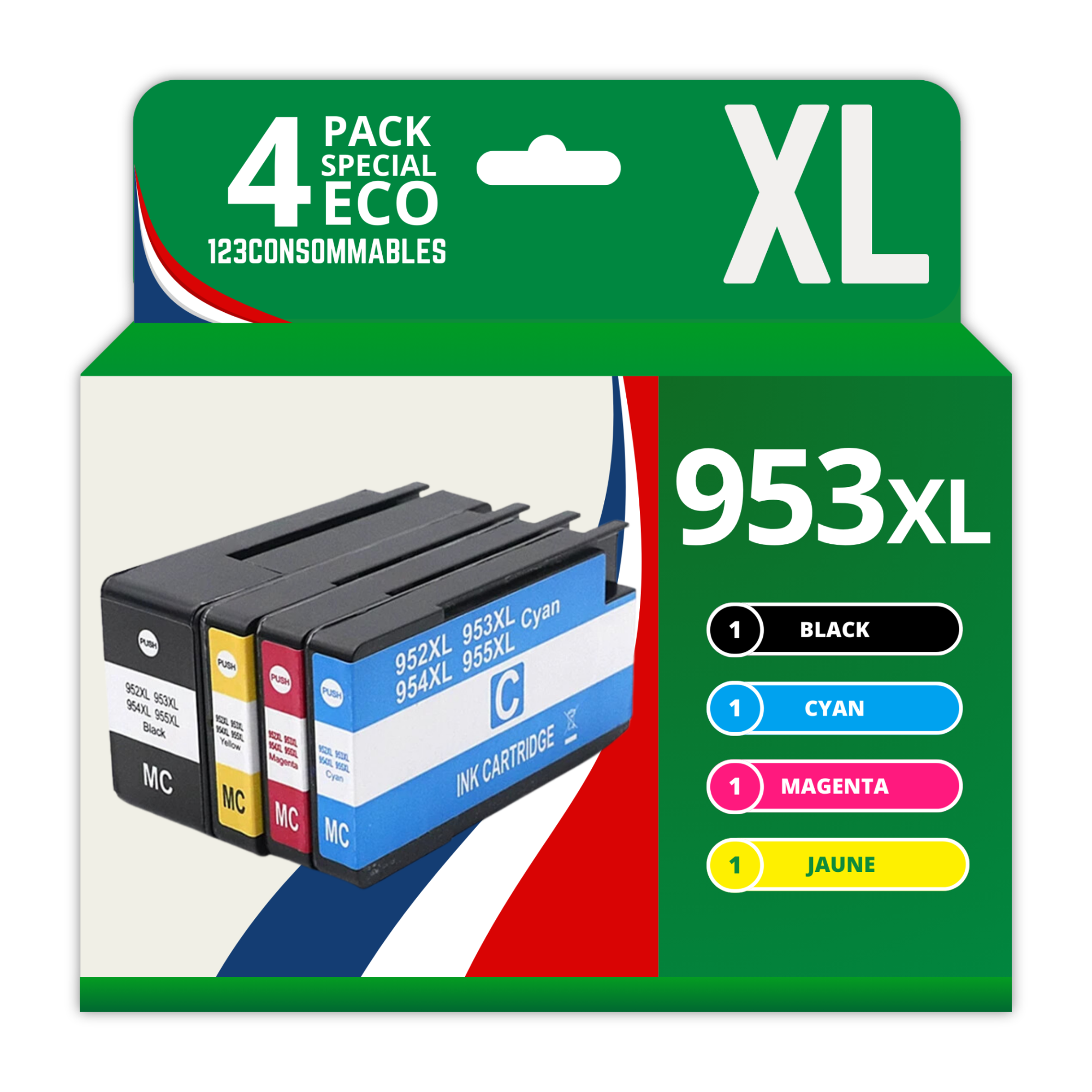 | Libellé | 123CONSOMMABLES - 953XL - Pack de 4 Cartouches d'encre compatibles avec HP Officejet Pro 8715 8710, HP Officejet Pro 7720 7740 8730 8720 8725 8210 |