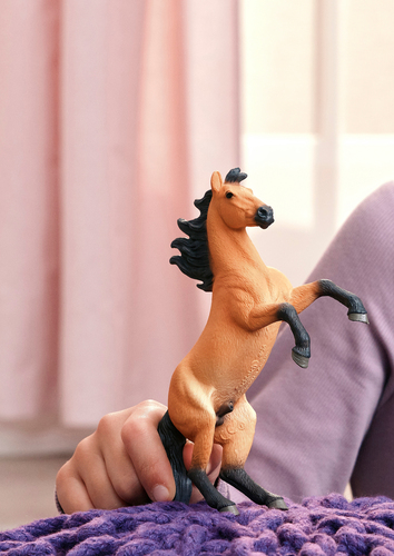 Mais cette fougueuse jument Mustang, à la robe blanche et brune, n'est pas seulement magnifique. Elle est aussi particulièrement curieuse. En ce moment, elle dresse attentivement l'oreille et ses doux yeux noirs regardent au loin, avec un très vif intérêt. Elle a dû entendre quelque chose. Peut-être le hennissement de l'étalon Mustang ? Elle enfonce ses petits sabots agiles dans le sol, prête à partir au galop à tout moment et à se lancer dans une aventure.