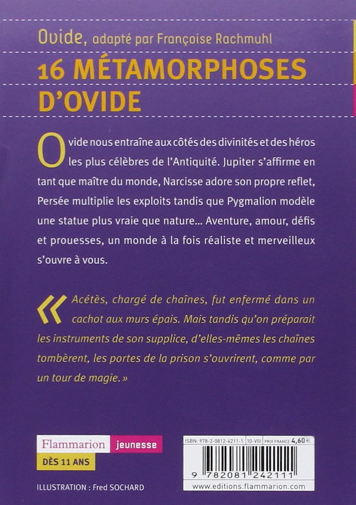 16 Métamorphoses d'ovide Ovide nous entraîne aux côtés des divinités et des héros les plus célèbres de l'Antiquité. Jupiter s'affirme en tant que maître du monde, Narcisse adore son propre reflet, Persée multiplie les exploits tandis que Pygmalion modèle une statue plus vraie que nature... Aventure, amour, défis et prouesses, un monde à la fois réaliste et merveilleux s'ouvre à vous. « Acétès, chargé de chaînes, fut enfermé dans un cachot aux murs épais. Mais tandis qu'on préparait les instruments de son supplice, d'elles-mêmes les chaînes tombèrent, les portes de la prison s'ouvrirent, comme par un tour de magie. »