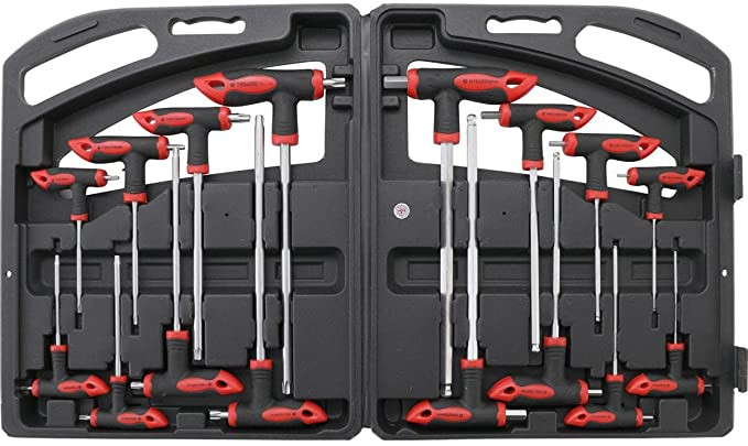 - 8 clés mâles à poignée T coudées Torx (dites clefs étoile) côté long et avec empreinte Résistorx côté court.