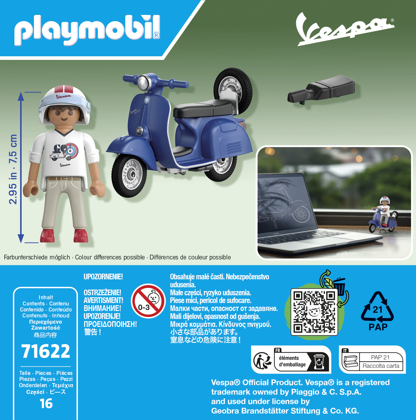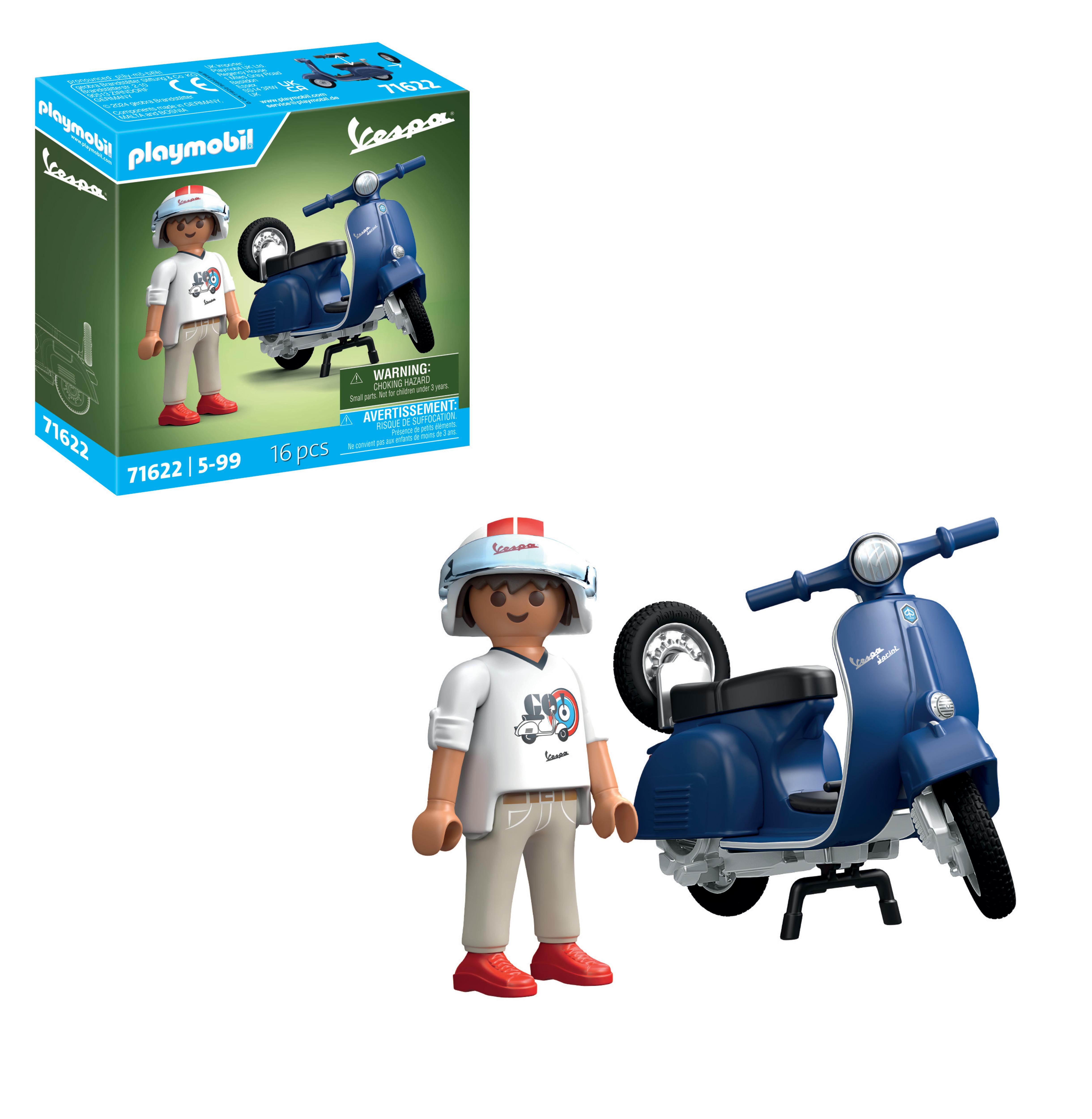 Que vous exploriez les rues de la ville ou voyagiez dans le temps, des aventures inoubliables vous attendent avec la Vespa 150 Sprint Veloce de 1969 en bleu par PLAYMOBIL ! Plongez dans l'atmosphère nostalgique des années 1960 et parcourez les rues avec élégance. Cet ensemble détaillé donne vie au design emblématique de la Vespa et offre des heures de plaisir tant aux enfants qu'aux passionnés adultes de scooters. Grâce à son pneu de secours amovible et à la possibilité de retirer les roues, vous pouvez simuler un véritable changement de pneu et assurer l'entretien professionnel de votre Vespa. La Vespa PLAYMOBIL est dotée de deux variantes de selles : une fidèle à l'original et une pour fixer le personnage PLAYMOBIL. Ainsi, la Vespa peut être personnalisée selon vos préférences !