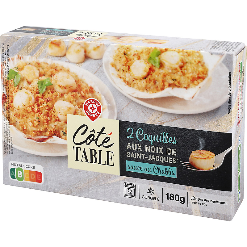 2 COQUILLES AUX NOIX DE SAINT-JACQUES* AVEC UNE SAUCE A BASE DE CHAMPIGNONS DE PARIS, CHABLIS ET CREME FRAICHE LEGERE - SURGELEES * Zygochlamys patagonica - origine : Argentine (A) ou Chlamys opercularis - origine Iles Féroé (B) ou Argopecten purpuratus - origine : Pérou (C) La lettre indiquée à côté du numéro de lot correspond à l'espèce et à l'origine géographique des noix de Saint-Jacques* mises en œuvre dans ce produit. COTE TABLE
