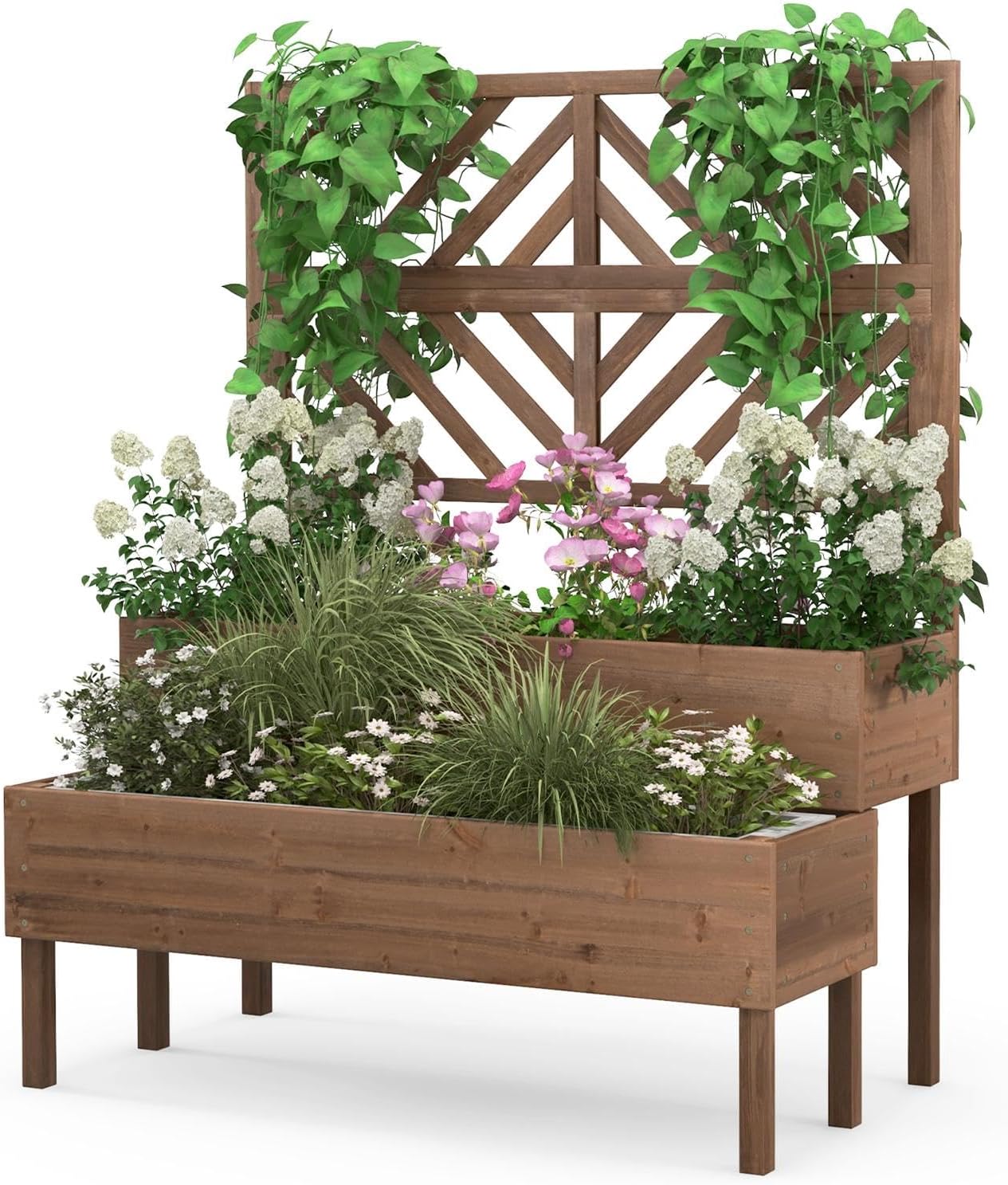 2 en 1 jardinière surélevée avec treillis en bois à 2 niveaux pour vigne, bac à fleurs avec trou marron