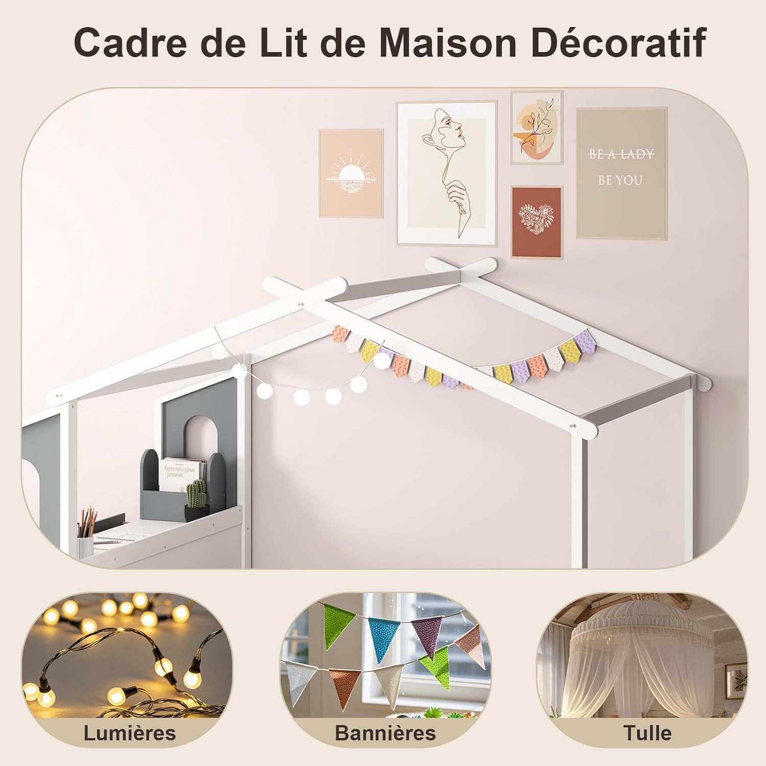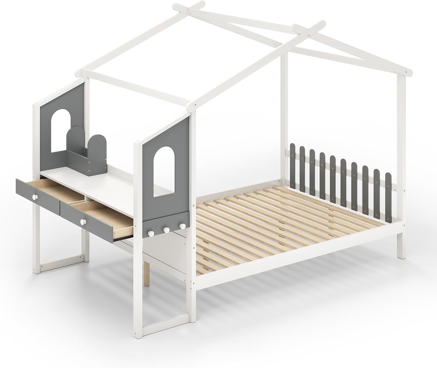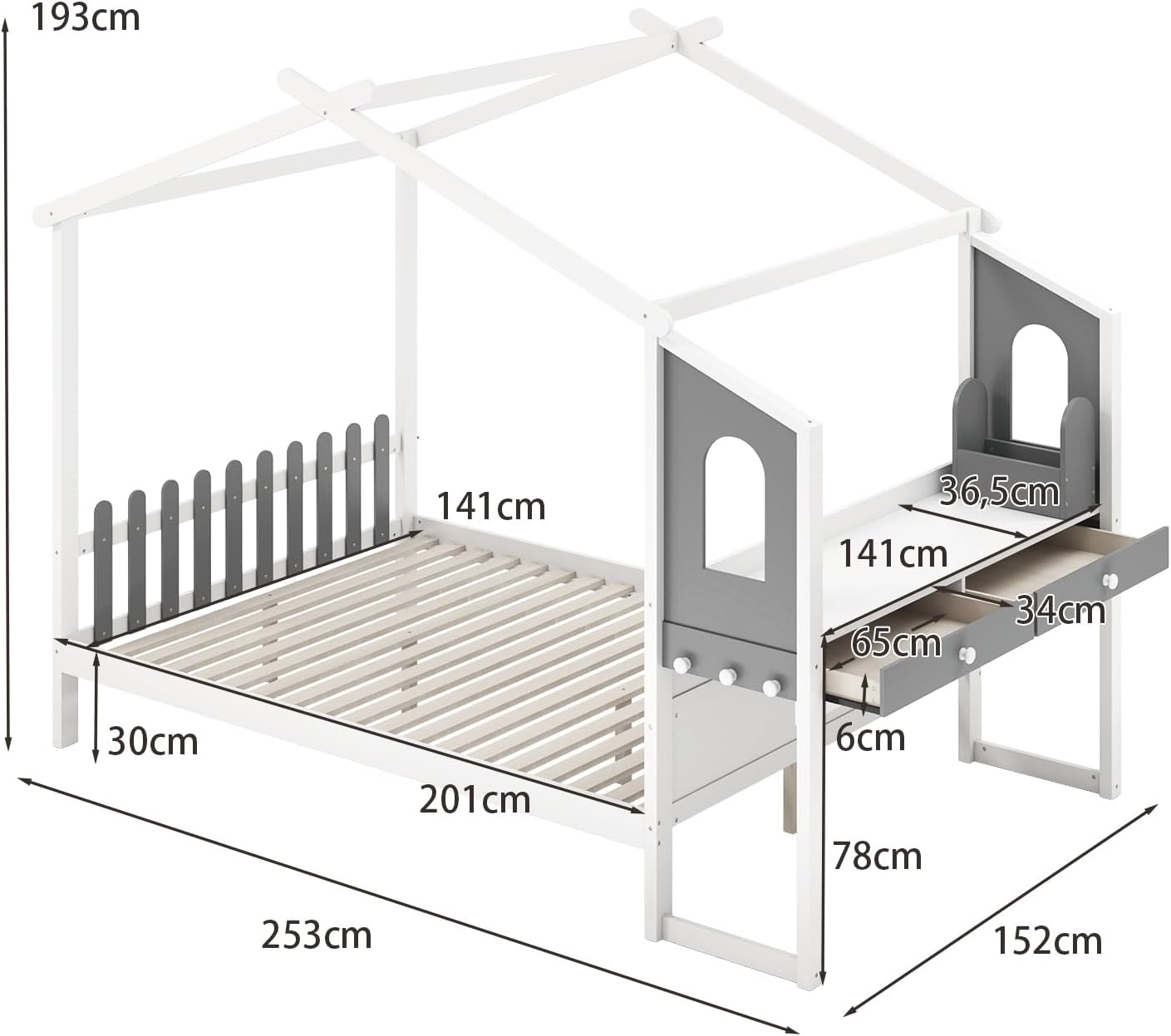 Voici notre charmant lit en forme de maison intéressant avec bureau d’étude et 2 tiroirs, le complément parfait à toute chambre d’enfant ou chambre d’amis. Le bureau intégré latéral offre un endroit pour étudier, dessiner ou faire ses devoirs. Et espace sous le lit de 21 cm laissant un grand espace de rangement pour les boîtes, la valise ou d’autres articles. Plus important encore, construit avec un cadre en bois de pin et des 18 lattes de qualité, le lit Montessori est stable et fiable, avec une capacité de charge maximale de 150 kg. Surprenez vos enfants avec ce cadeau incroyable qui allie fonctionnalité et plaisir !