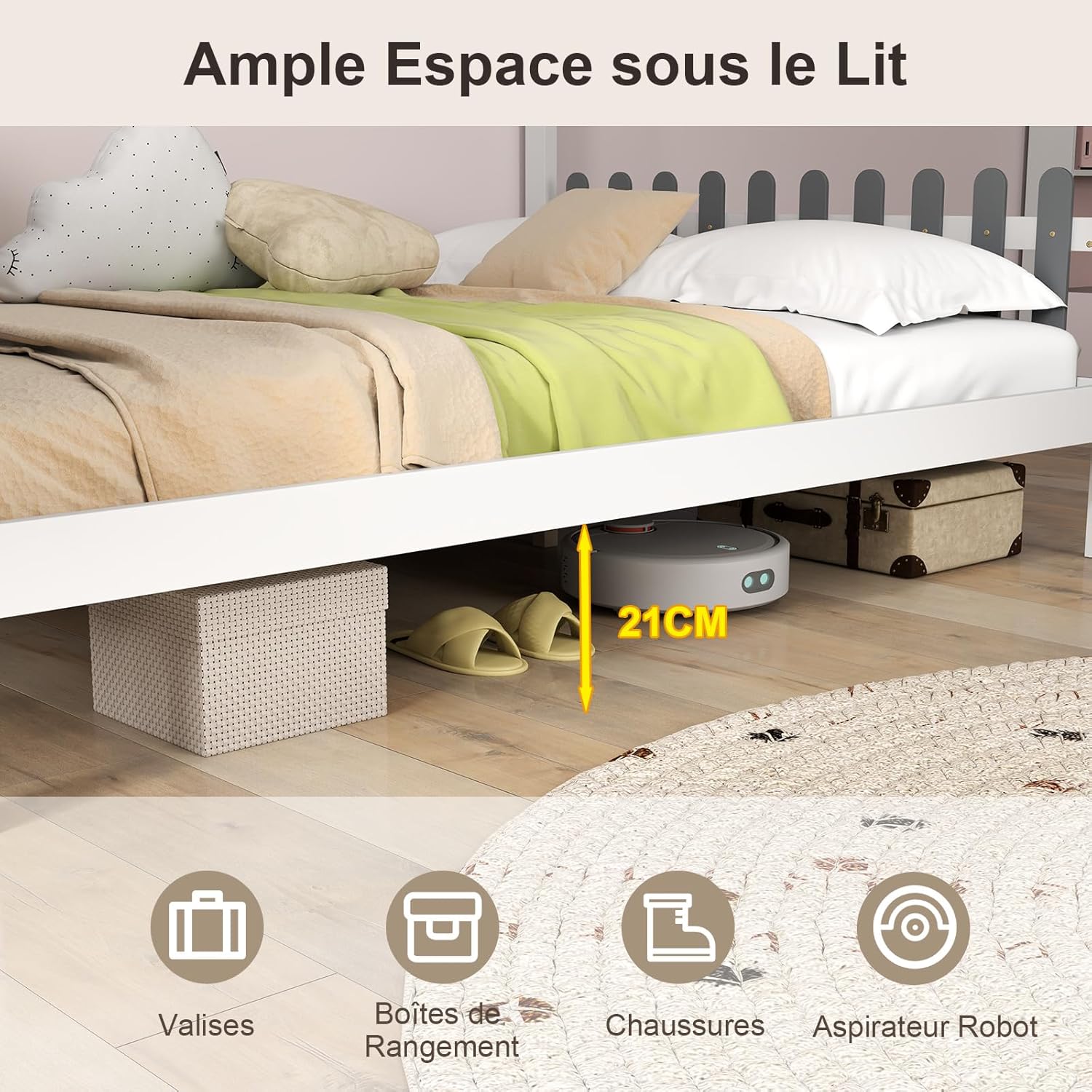 Grand espace de rangement sous le lit, parfait pour ranger des toutes sortes d’articles