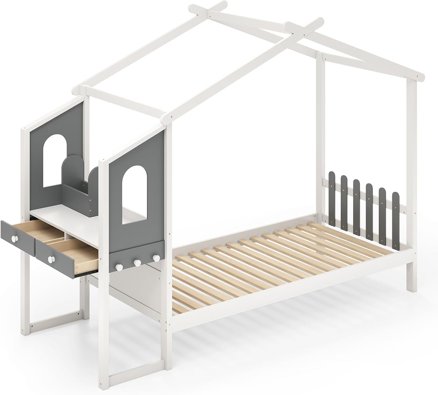 Voici notre charmant lit en forme de maison intéressant avec bureau d’étude et 2 tiroirs, le complément parfait à toute chambre d’enfant ou chambre d’amis. Le bureau intégré latéral offre un endroit pour étudier, dessiner ou faire ses devoirs. Et espace sous le lit de 21 cm laissant un grand espace de rangement pour les boîtes, la valise ou d’autres articles. Plus important encore, construit avec un cadre en bois de pin et des 18 lattes de qualité, le lit Montessori est stable et fiable, avec une capacité de charge maximale de 150 kg. Surprenez vos enfants avec ce cadeau incroyable qui allie fonctionnalité et plaisir !