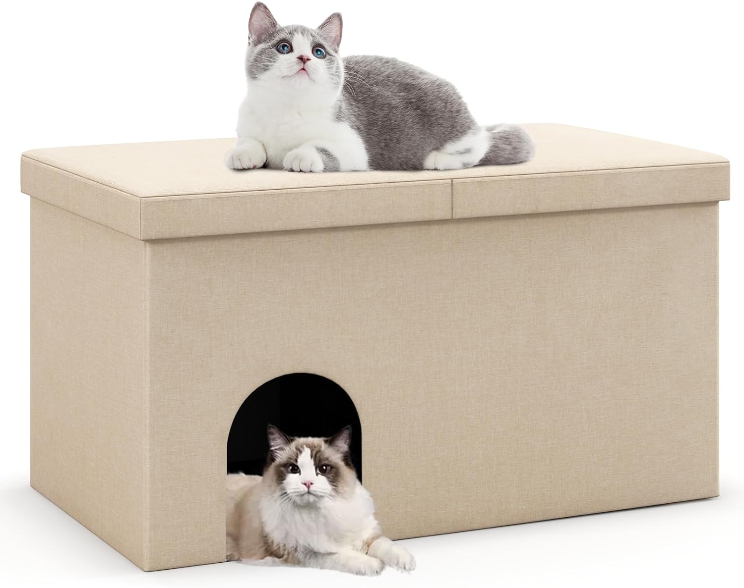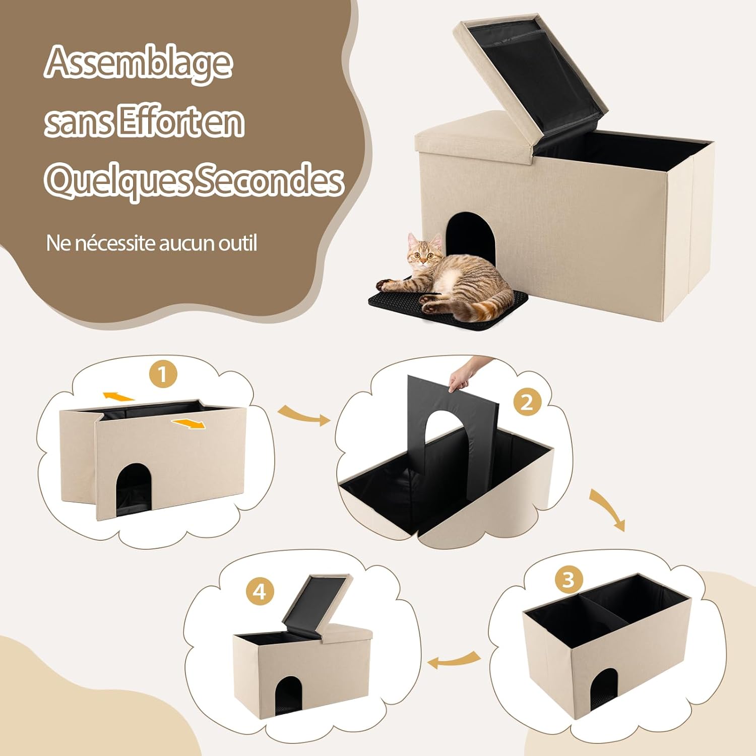 2 en 1 maison de toilette pour chat, meuble litière caché pliable pour chat avec tapis de litière,beige