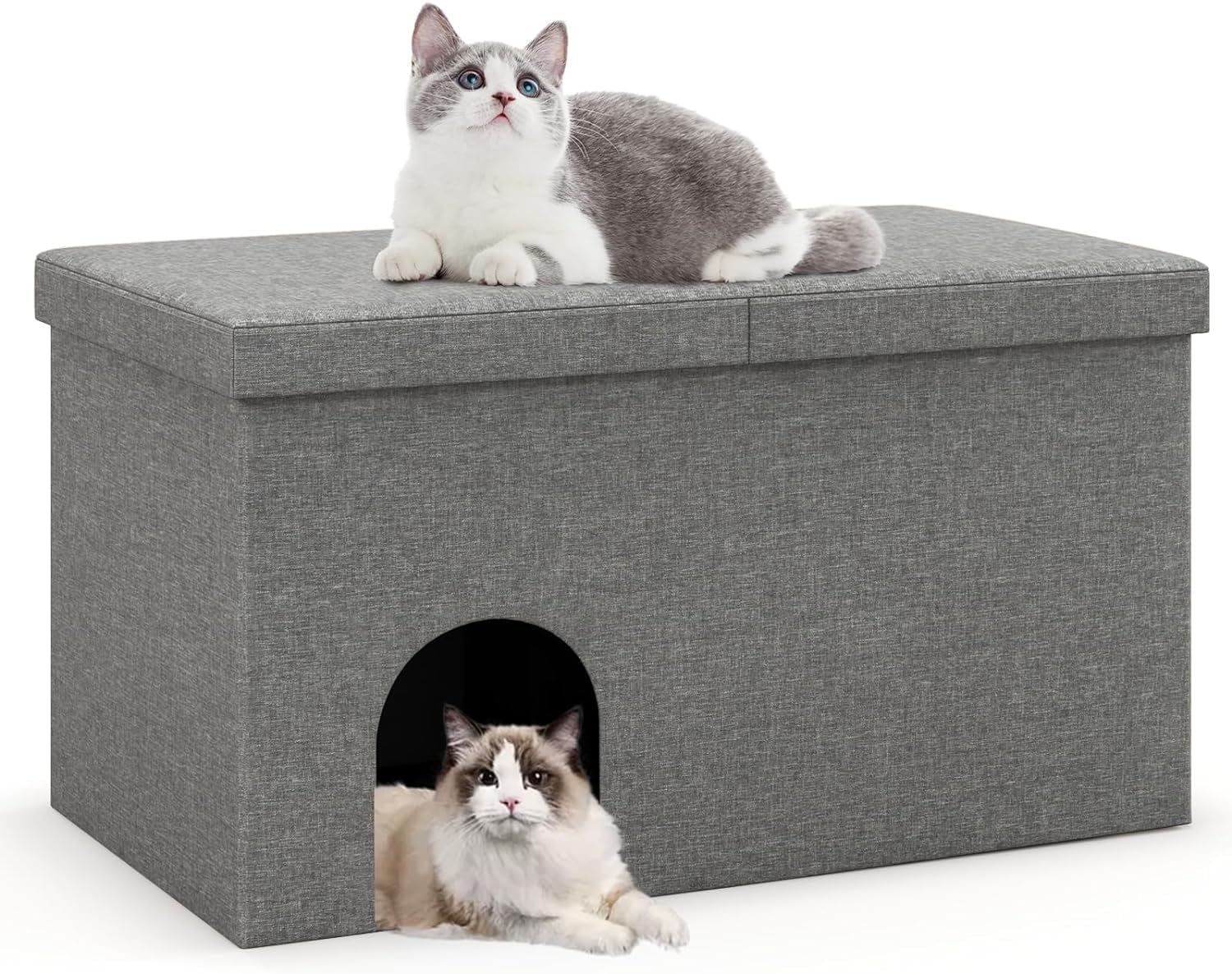 2 en 1 maison de toilette pour chat, meuble litière caché pliable pour chat avec tapis de litière,gris