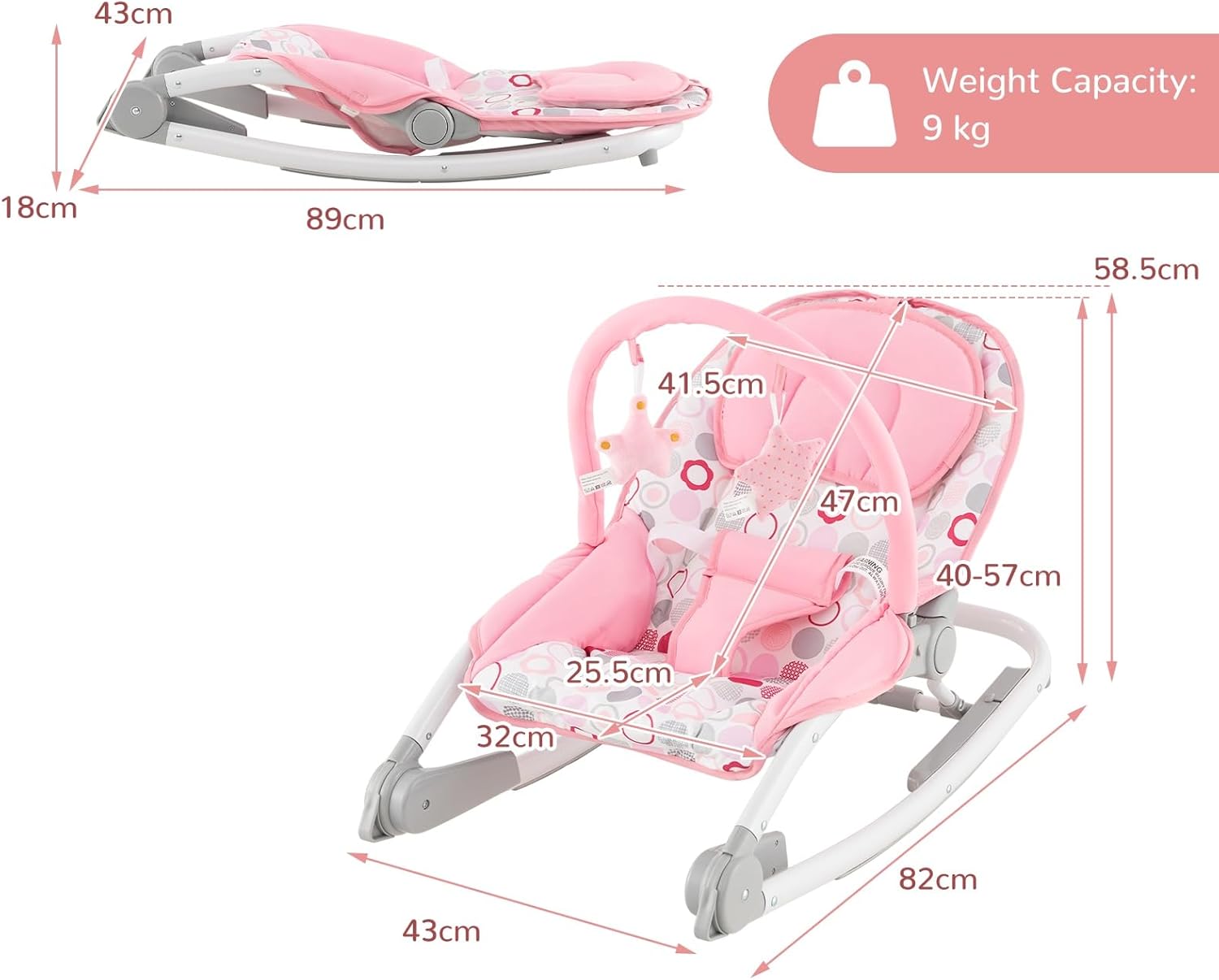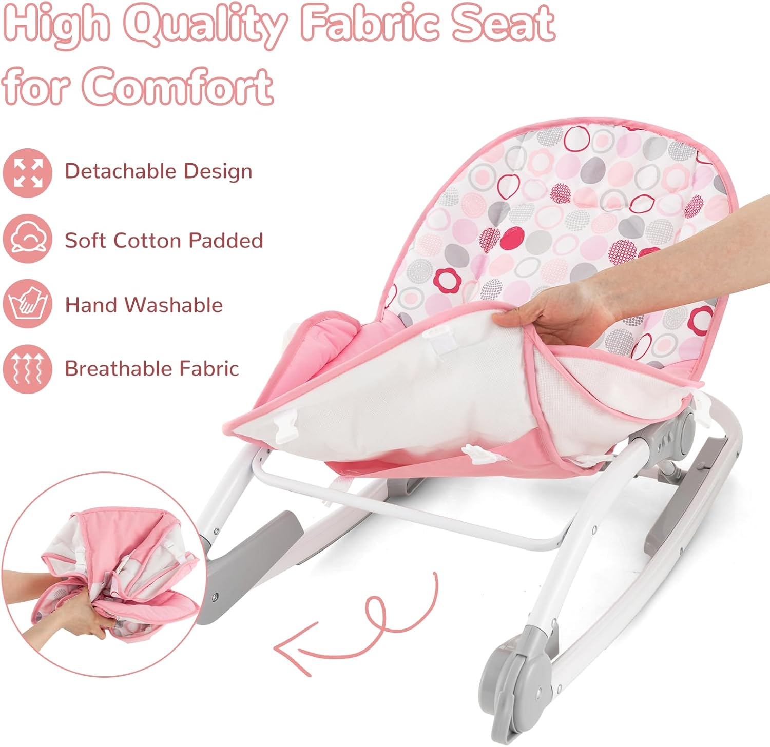 - Taille compacte — Lorsqu'il n'est pas utilisé, les parents peuvent facilement plier ce fauteuil à bascule pour bébé en une taille compacte, ce qui permet de le ranger dans un coin, sous le lit ou dans le placard. De plus, son poids léger de 3,5 kg permet également de le porter d'une seule main.