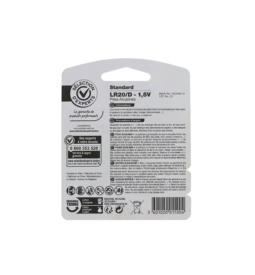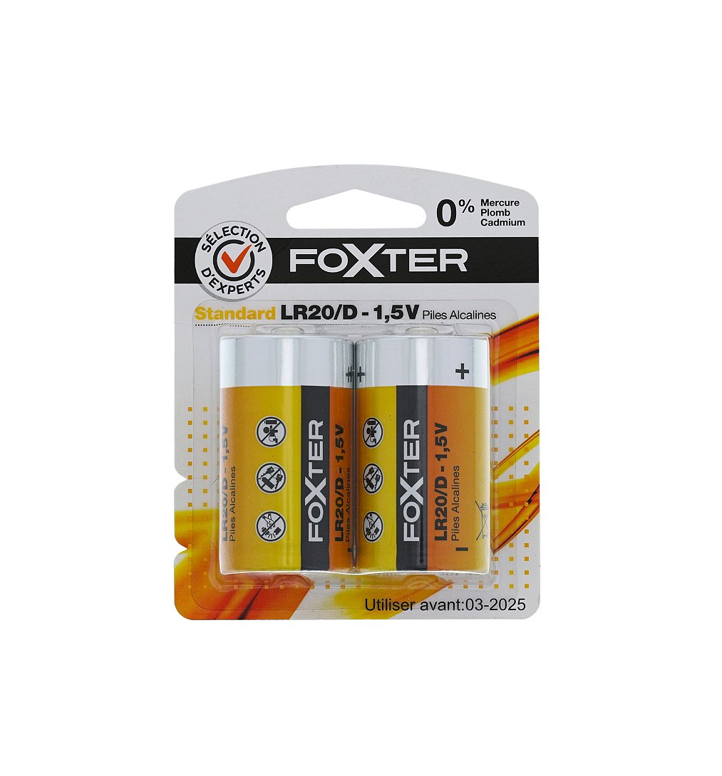 | Libellé | 2 piles alcalines LR20/D 1,5V - Standard - Sélection d'Experts - Foxter |