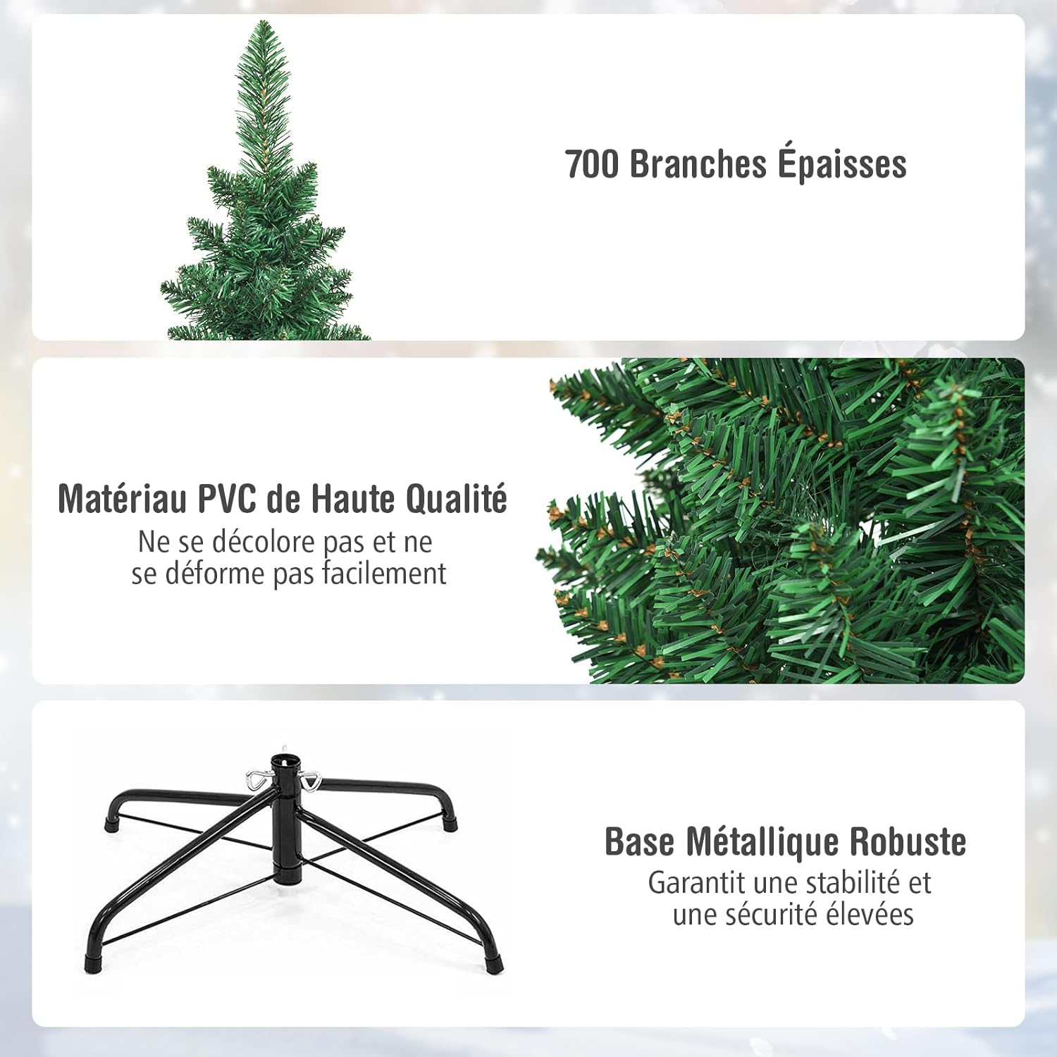 - Décoration n’est pas limitée : Le châssis de l’arbre de Noël est grand, les branches et les feuilles épaisses, ce qui facilite la décoration. Il a un nombre de 700 branches, 3 troncs peuvent atteindre 210 après assemblage. Il peut être décoré à sa guise, et vous pouvez y accrocher tout ce que vous voulez.