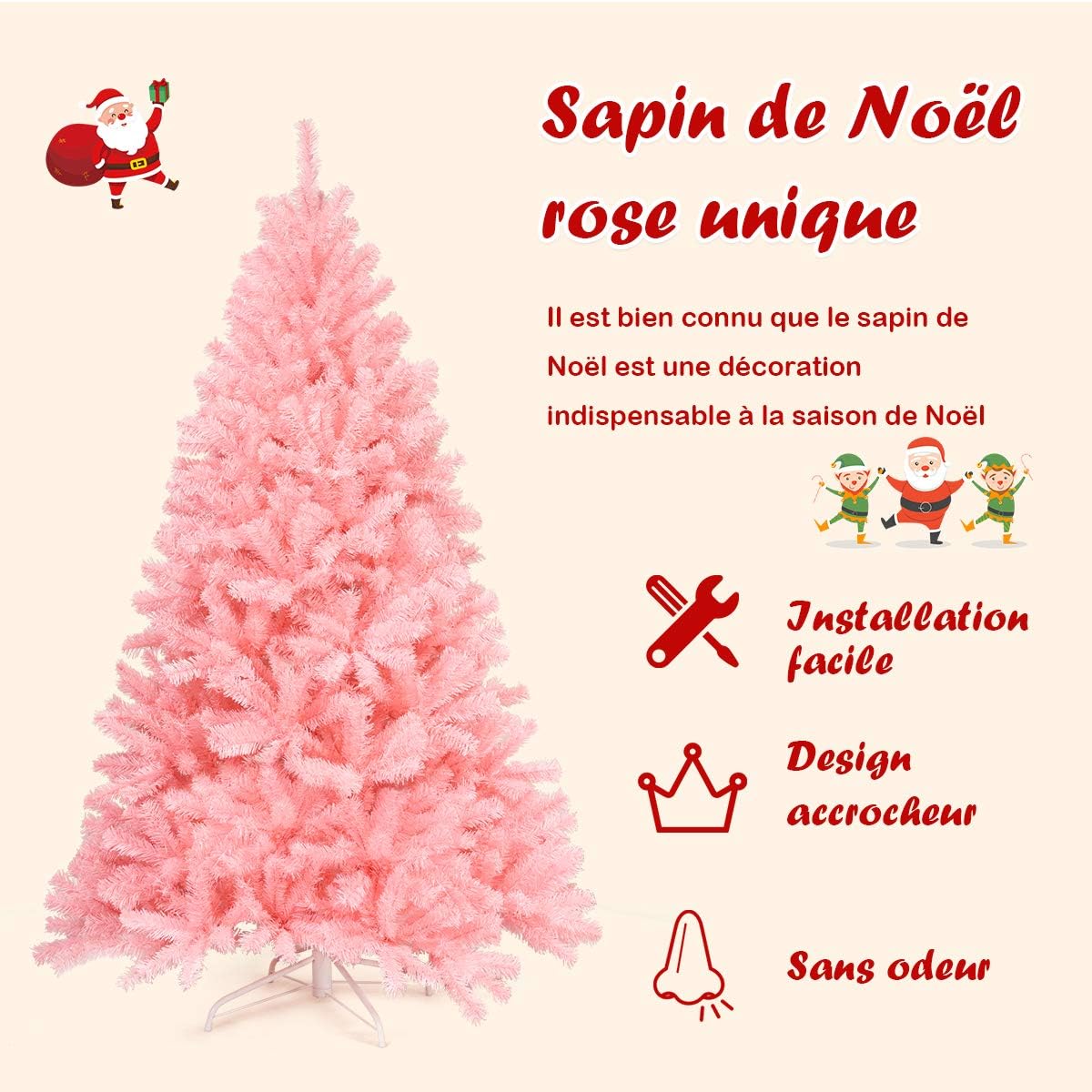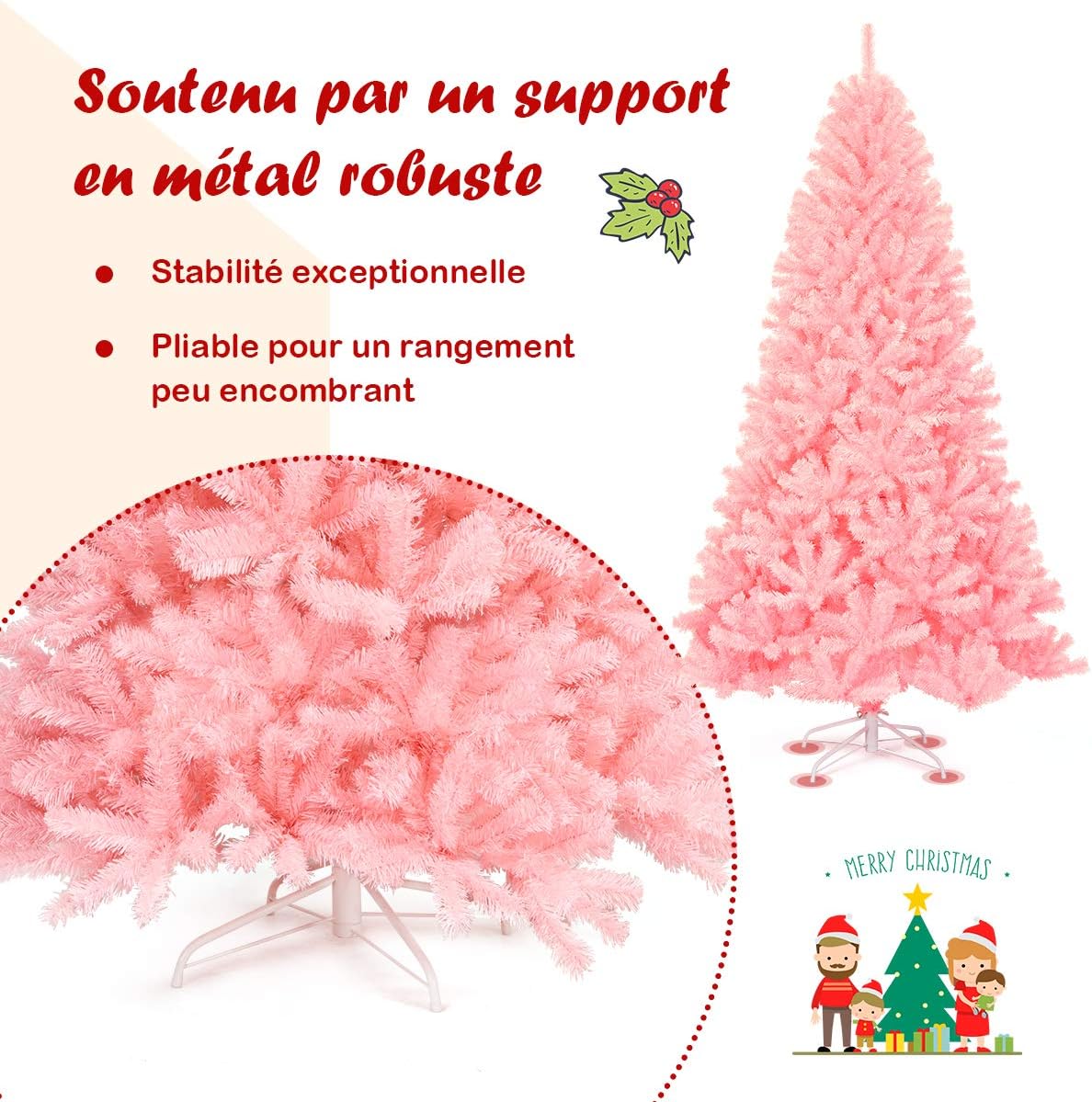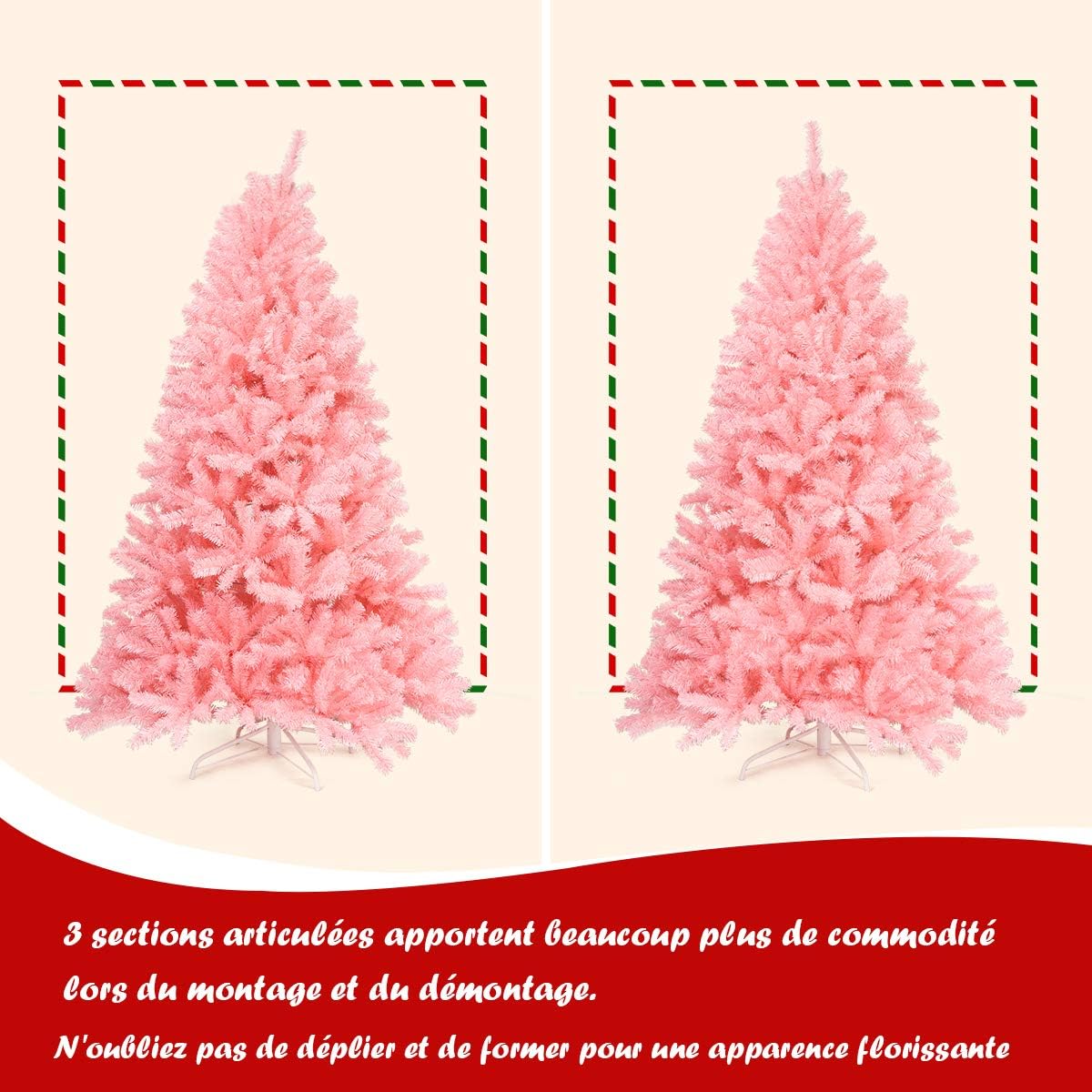 | Libellé | 230cm sapin de noël artificiel rose avec 1036 branches en pvc ignifuge base en fer, ouverture automatique |