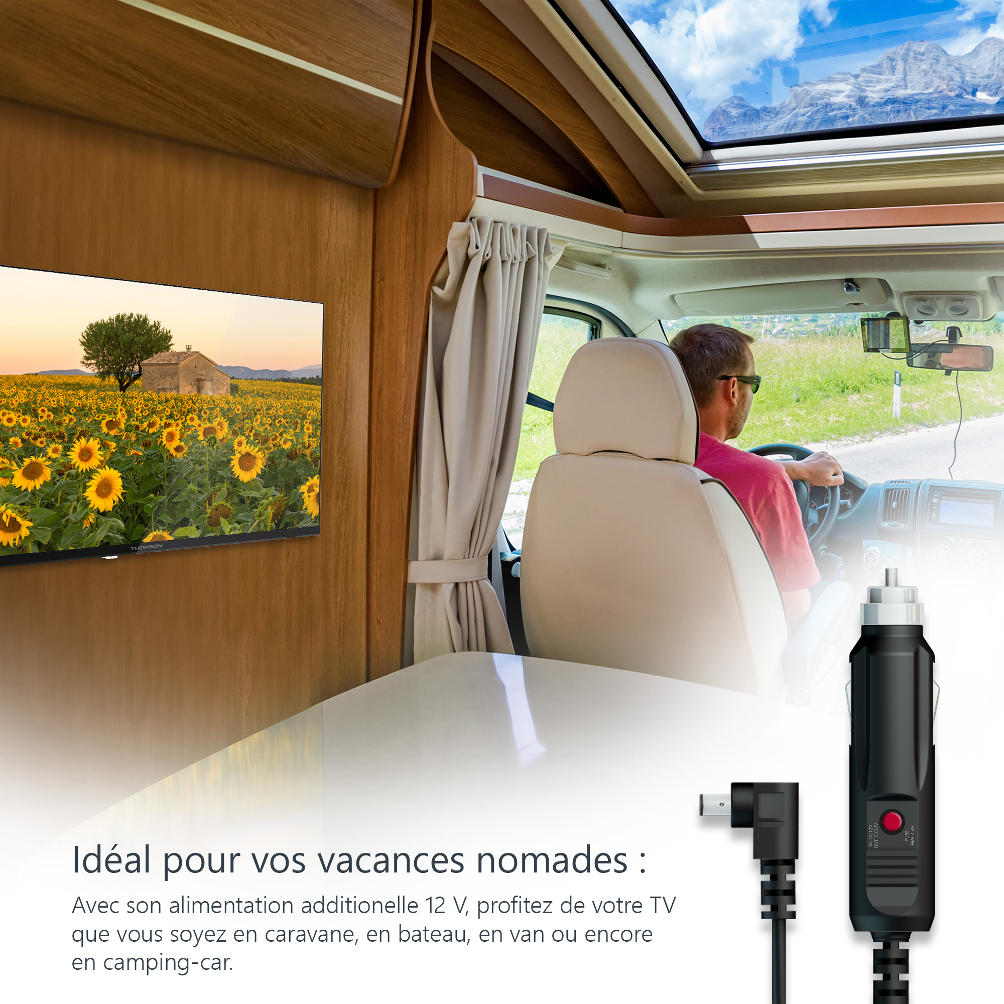 Faites l'expérience d'un divertissement complet et pour toute la famille avec le téléviseur android tv 24” hd 12v de thomson. Profitez de vos films préférés lors de vos prochaines vacances en plein air. Nos téléviseurs camping sont équipés d'un adaptateur 12 volts, et grâce à sa connectivité wifi vous pouvez accéder à tous les contenus de votre smart tv en utilisant votre smartphone comme hotspot. Emportez votre divertissement avec vous sur la route, que vous soyez en camping-car, van, camion ou même bateau. Android tv rend votre expérience télévisuelle encore plus pratique: accès à plus de 400 000 films et émissions de télévision à partir des nombreuses applications disponibles, contrôle vocal intelligent avec google assistant, chromecast intégré pour diffuser sans fil des films, de la musique et des vidéos à partir d'appareils compatibles. Et avec le bouton "favoris" de votre télécommande, accédez rapidement à votre application préféré. grâce à son design élégant et son cadre sans bords sur 3 côtés, vous pouvez vous concentrer pleinement sur l'action à l'écran. La technologie dolby audio crée une expérience sonore dynamique. le triple tuner intégré permet la réception via une antenne satellite, une antenne terrestre ou le câble. Ainsi, vous pouvez recevoir toutes les chaînes disponibles sans matériel supplémentaire. La télécommande ergonomique avec rétroéclairage vous permet de garder un oeil sur tout, même dans une ambiance tamisée. 1. Android tv : le divertissement le plus complet donnant accès à de nombreuses applications.* 2. Assistant vocal google: utilisez tout simplement votre voix pour contrôler votre tv. 3. Chromecast built-in intégré: diffusez sur votre tv films et musiques depuis vos appareils connectés compatibles. 4. Bouton favoris: désignez votre application favorite pour l'ouvrir en 1 click. 5. Télécommande premium rétroéclairée: gardez un oeil sur tous vos boutons, même dans la pénombre. 6. Triple tuner: recevez la tv par tnt, câble ou encore satellite, sans matériel supplémentaire. 7. Dolby audio: profitez d'un son dynamique et précis. 8. Design sans cadre: un design élégant et moderne, sans bords sur 3 côtés. 9. Idéal pour vos vacances en camping: avec adaptateur secteur 12 v pour un divertissement optimal en route. 10. Deux possibilités d'installation : réduire la surface de pose de 60 à 30 cm. 11. Deux options de montage des pieds: réduisez leur écartement de 60cm à 30cm. 12. Disponible en noir premium ou blanc pur: choisissez la couleur qui vous correspond le mieux. 13. Garantie prolongée: garantie constructeur complète de 3 ans, preuve de fiabilité. 14. Panel de grade a+: les tv thomson utilisent les meilleurs dalles, pour la meilleure image. 15. Assemblé en europe: garantissant la qualité de nos tvs et réduisant la distance de transport.