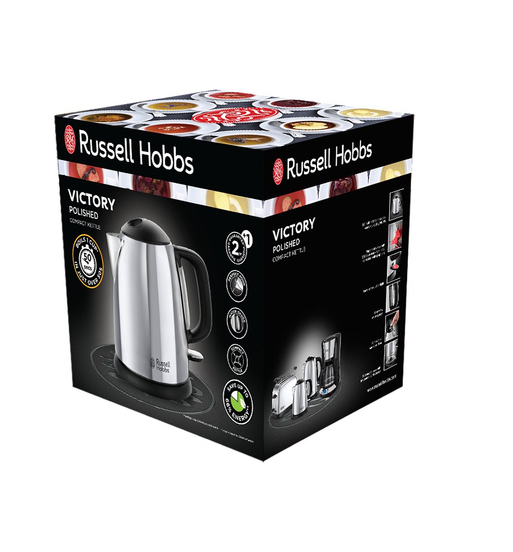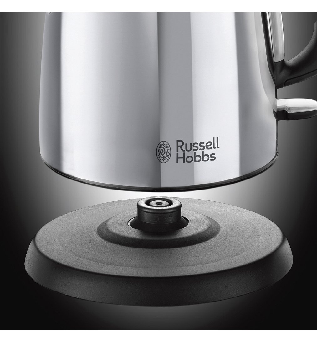 Russell Hobbs Victory. Capacité du réservoir d'eau: 1 L. Puissance: 2400 W. Couleur du produit: Noir, Acier inoxydable, Matériau du boîtier/corps: Acier inoxydable, Indicateur de niveau d'eau, Arrêt de sécurité en cas de surchauffe. Sans fil
