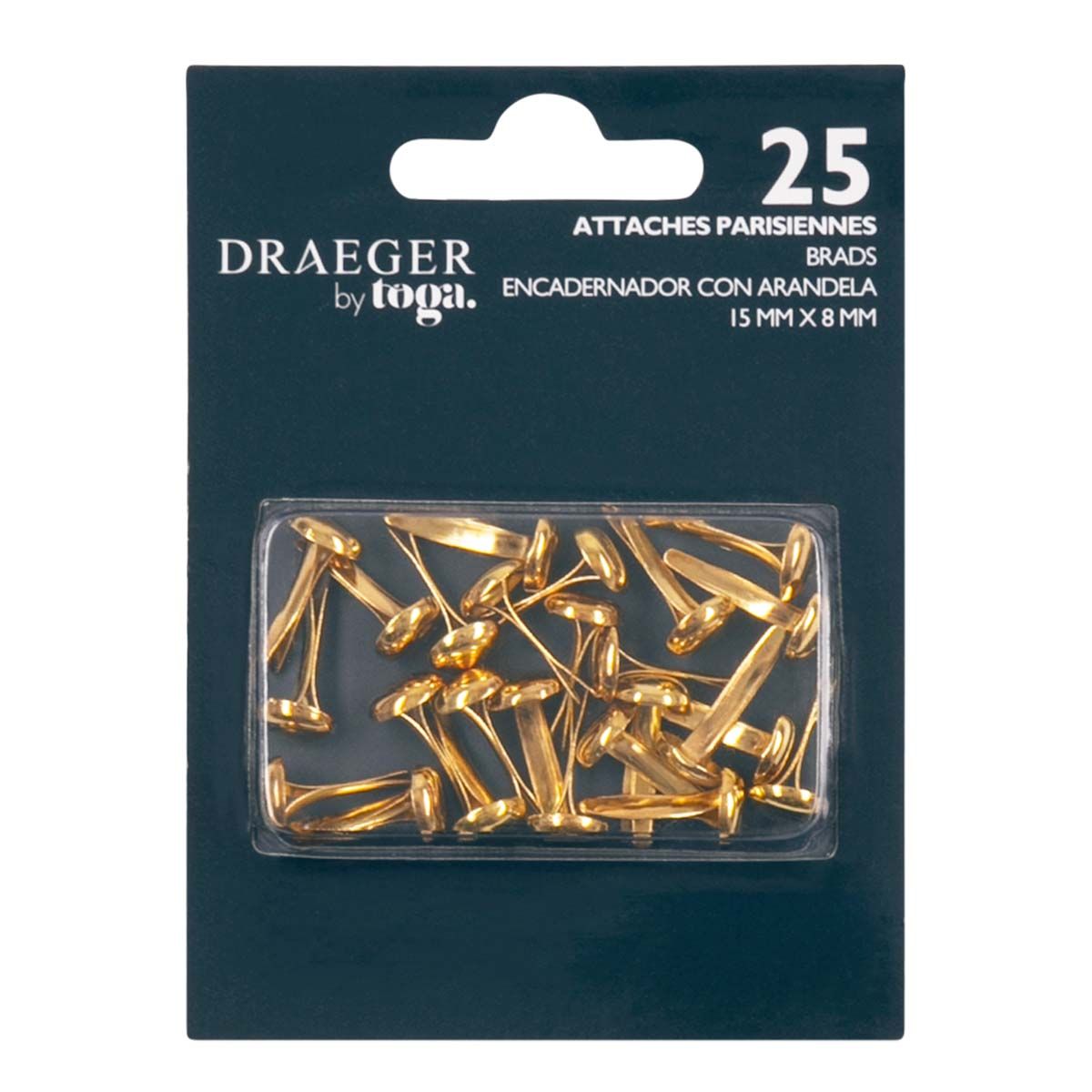 25 attaches parisiennes rondes en métal doré, faciles à poser. Pour les utiliser, créez un trou dans votre support à l'aide d'un perce-papier, glissez-y une attache parisienne, puis dépliez-là. Sa tête ronde et sa couleur dorée vont embellir vos créations de scrapbooking ou de carterie. Vous ne pourrez plus vous passez de ces fixations à la fois pratiques et décoratives ! Dimensions : hauteur de 15 mm / diamètre de 8 mm. À utiliser avec notre perce-papier (Référence : OU01).