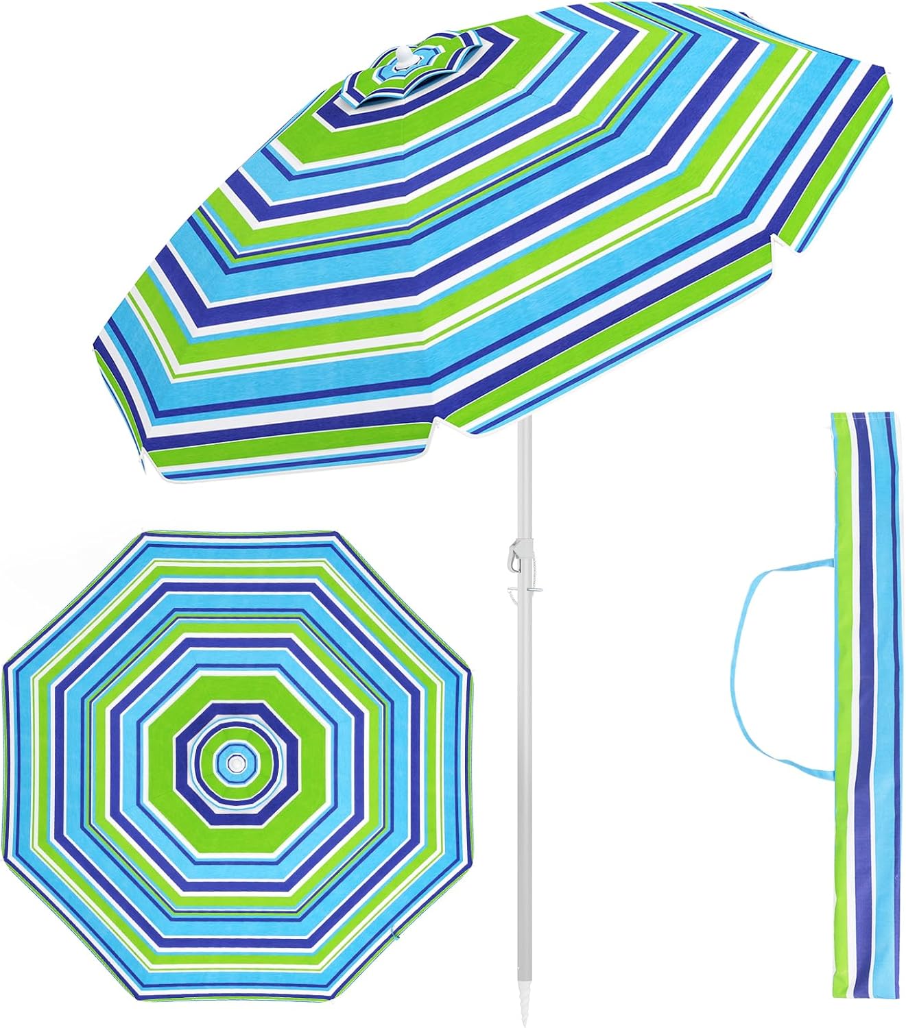Profitez des journées ensoleillées au frais sous l’ombre du parasol de plage et ses rayures multicolores. Notre parasol de plage à une protection solaire UV50. Protégez votre peau et celle de ceux que vous aimez avec ce parasol de plage ou de piscine .Sa structure en aluminium la rend légère et résistante à la fois.Il peut être démonté et rangé rapidement, vous pouvez mettre le parasol dans le sac de transport et l'emmener n'importe où sans fardeau.