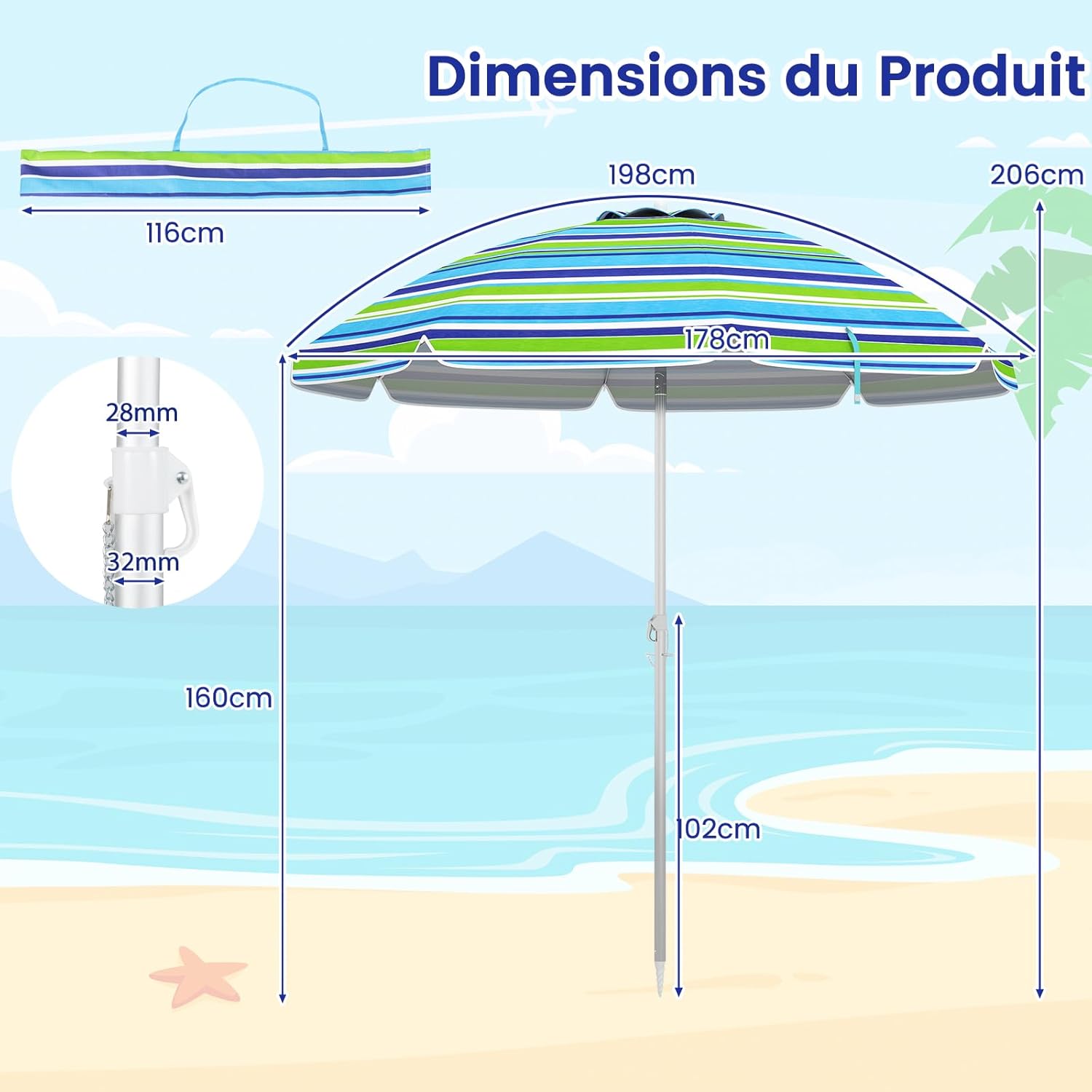 - Parasol de plage réglable : Le réglage facile de l'inclinaison par bouton-poussoir lui permet de suivre le soleil et de maximiser votre ombre à tout moment de la journée. Conception toit coupe-vent qui favorise la circulation de l'air.