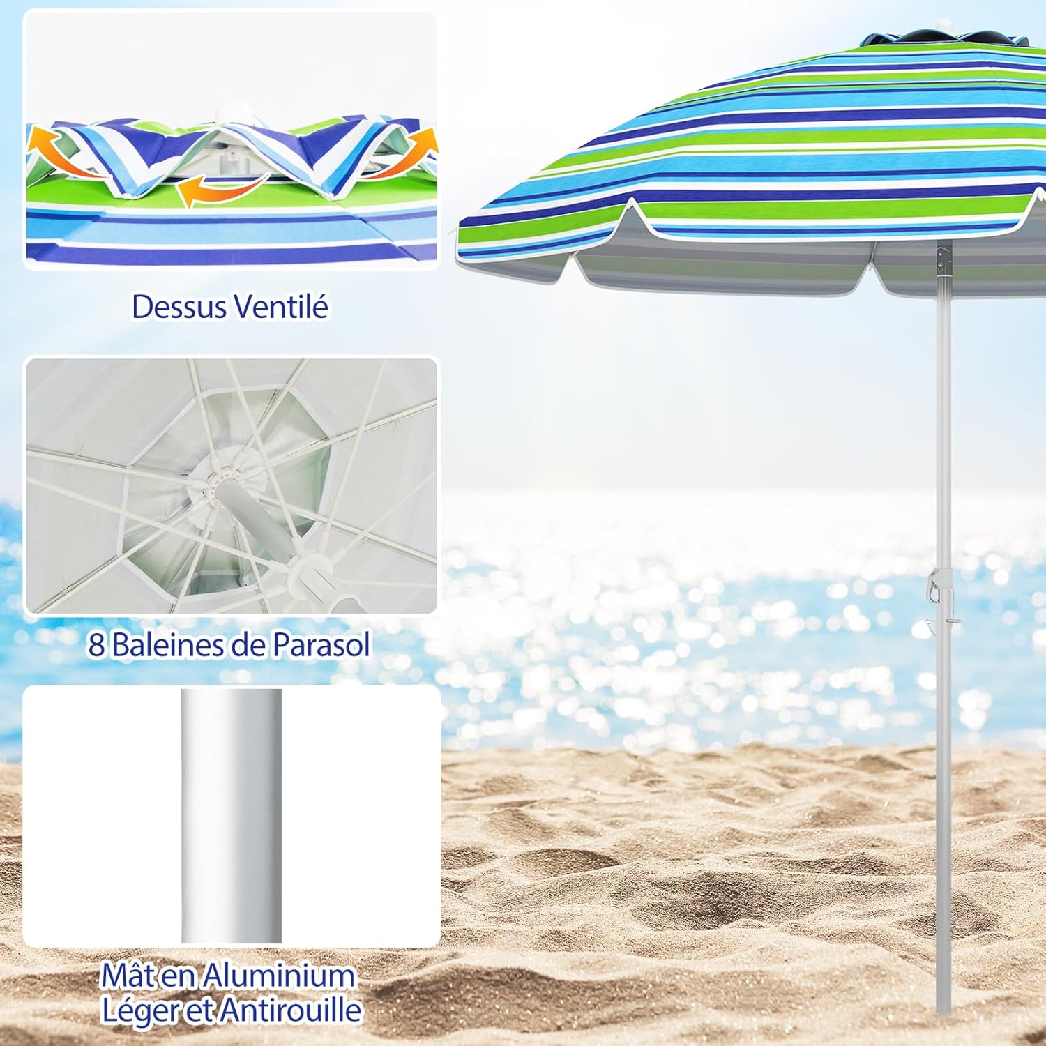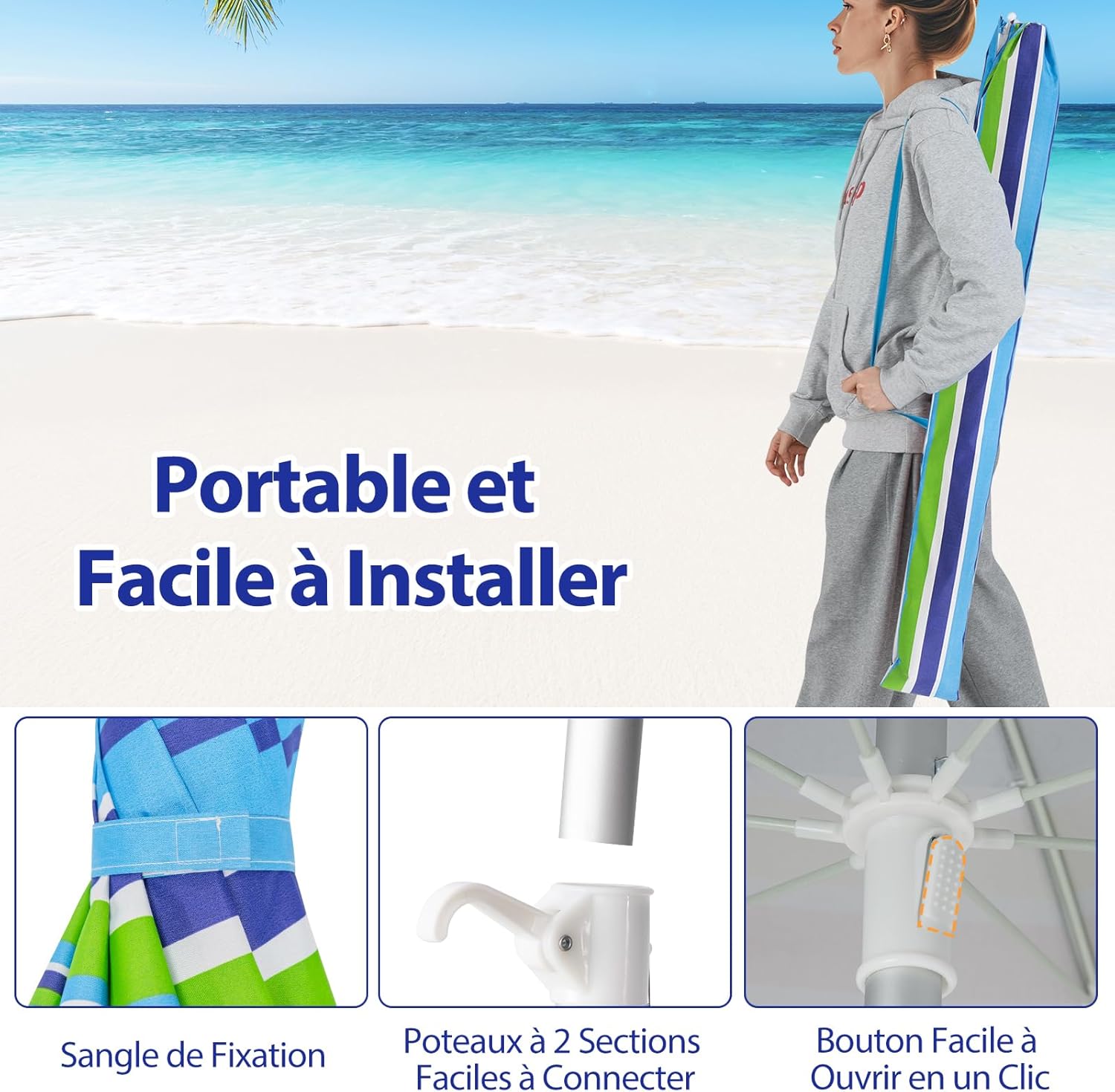 - Parasol Anti-UV : Vous recherchez un parasol de qualité supérieure pour vos voyages à la plage? Notre parasol est une solution parfaite pour vous. Il a un revêtement UV argenté à l'intérieur pour une protection solaire supplémentaire.
