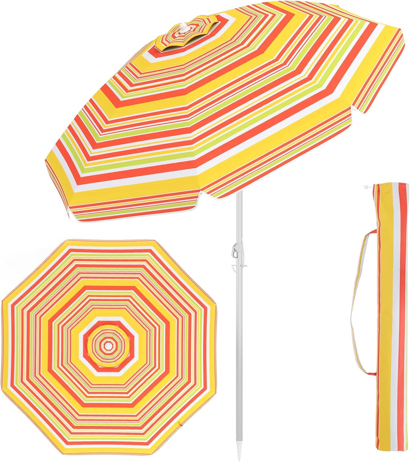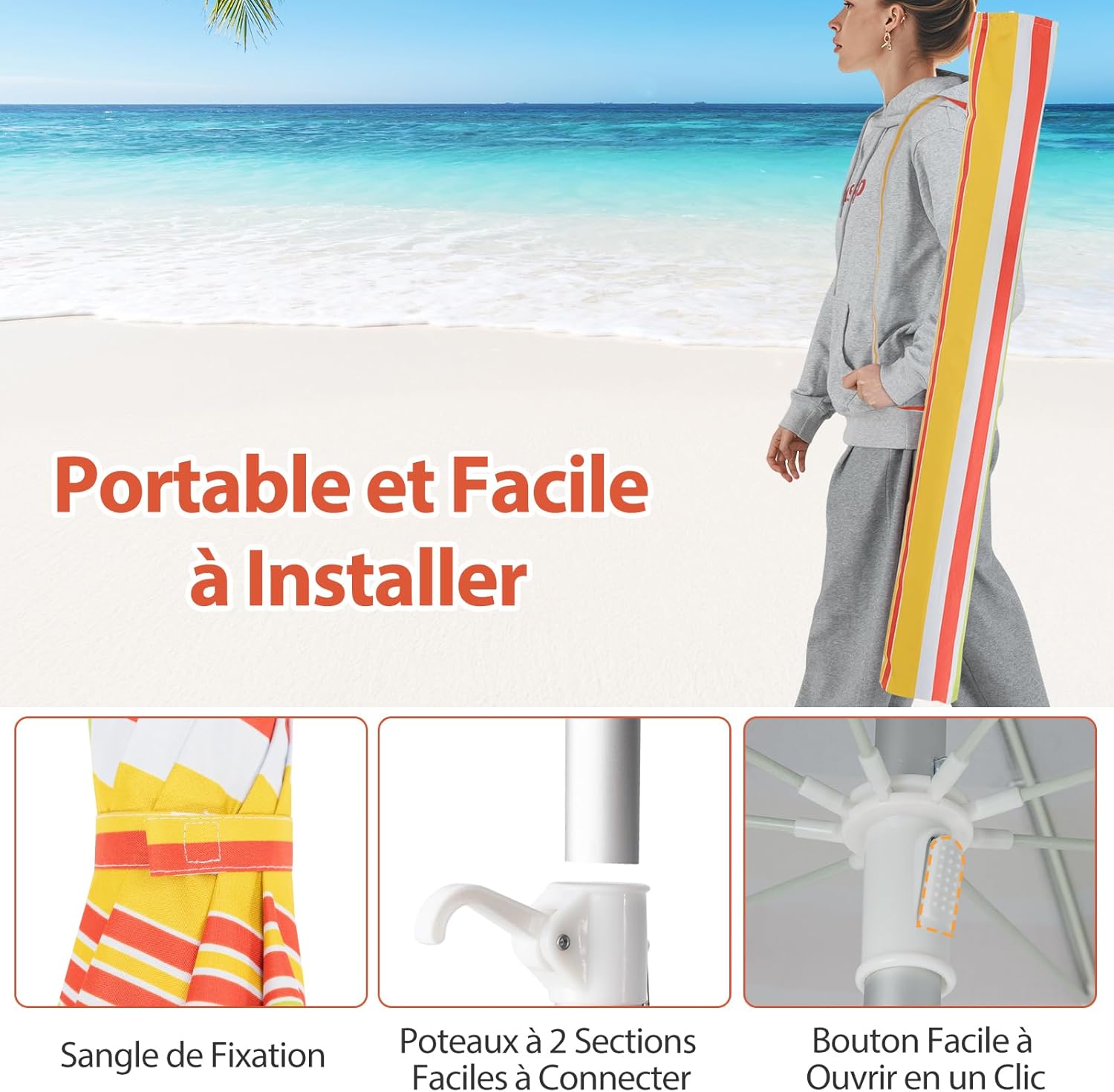Profitez des journées ensoleillées au frais sous l’ombre du parasol de plage et ses rayures multicolores. Notre parasol de plage à une protection solaire UV50. Protégez votre peau et celle de ceux que vous aimez avec ce parasol de plage ou de piscine .Sa structure en aluminium la rend légère et résistante à la fois.Il peut être démonté et rangé rapidement, vous pouvez mettre le parasol dans le sac de transport et l'emmener n'importe où sans fardeau.