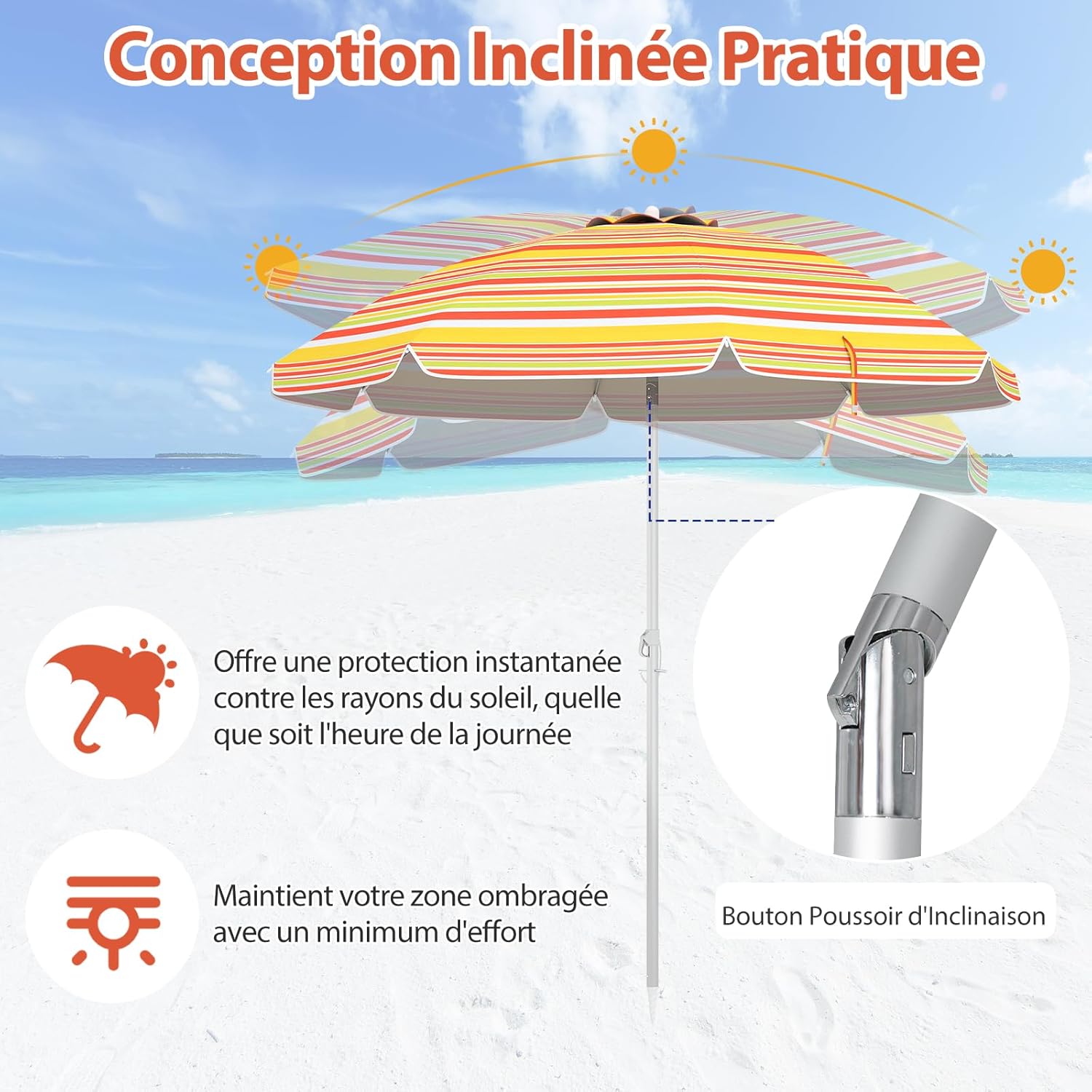 • Parasol de plage réglable : Le réglage facile de l'inclinaison par bouton-poussoir lui permet de suivre le soleil et de maximiser votre ombre à tout moment de la journée. Conception toit coupe-vent qui favorise la circulation de l'air.