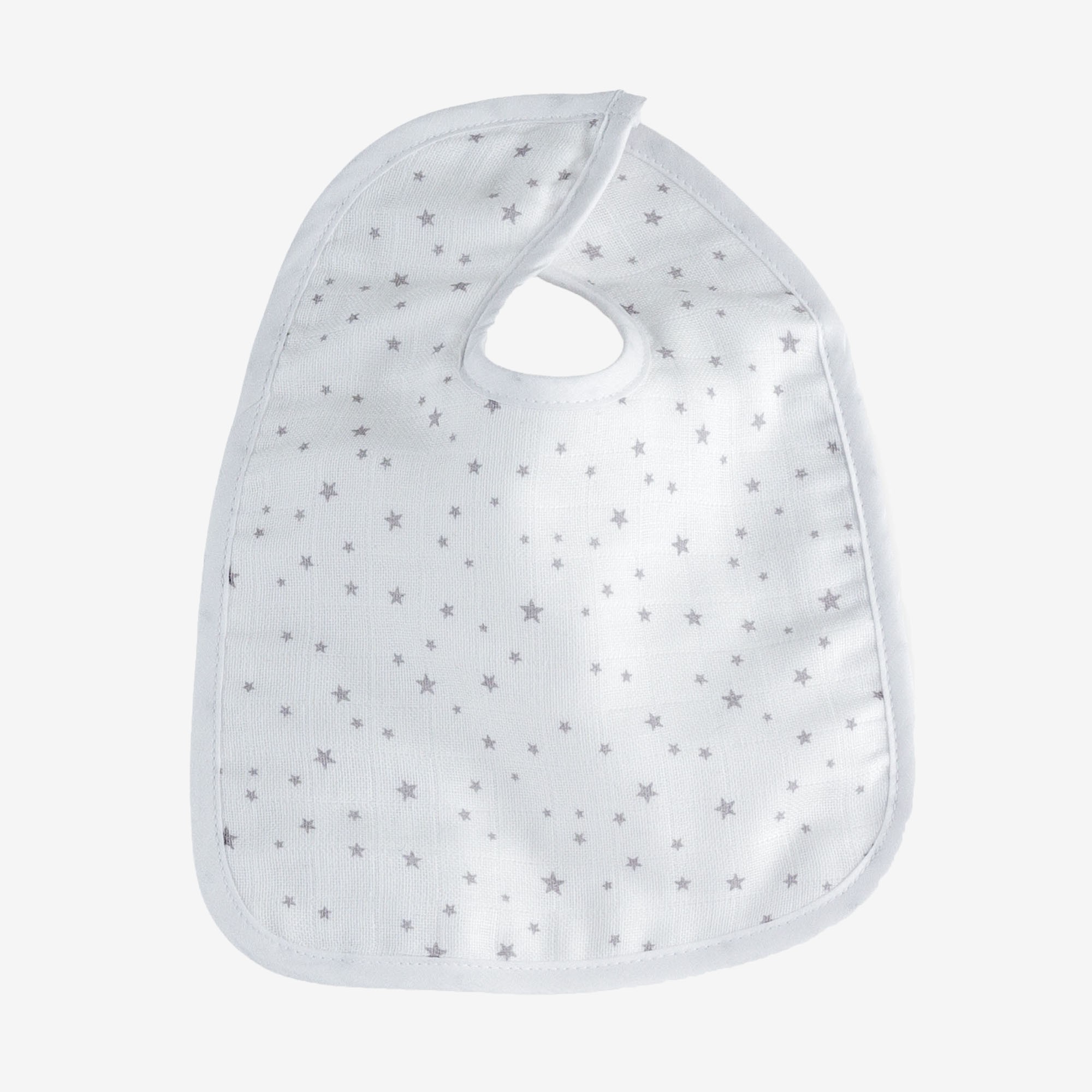 Lot de 3 bavoirs 1er âge pour bébé en mousseline 100% coton, ces bavoir s'attachent dans le dos. Motif étoiles grises sur fond blanc.
