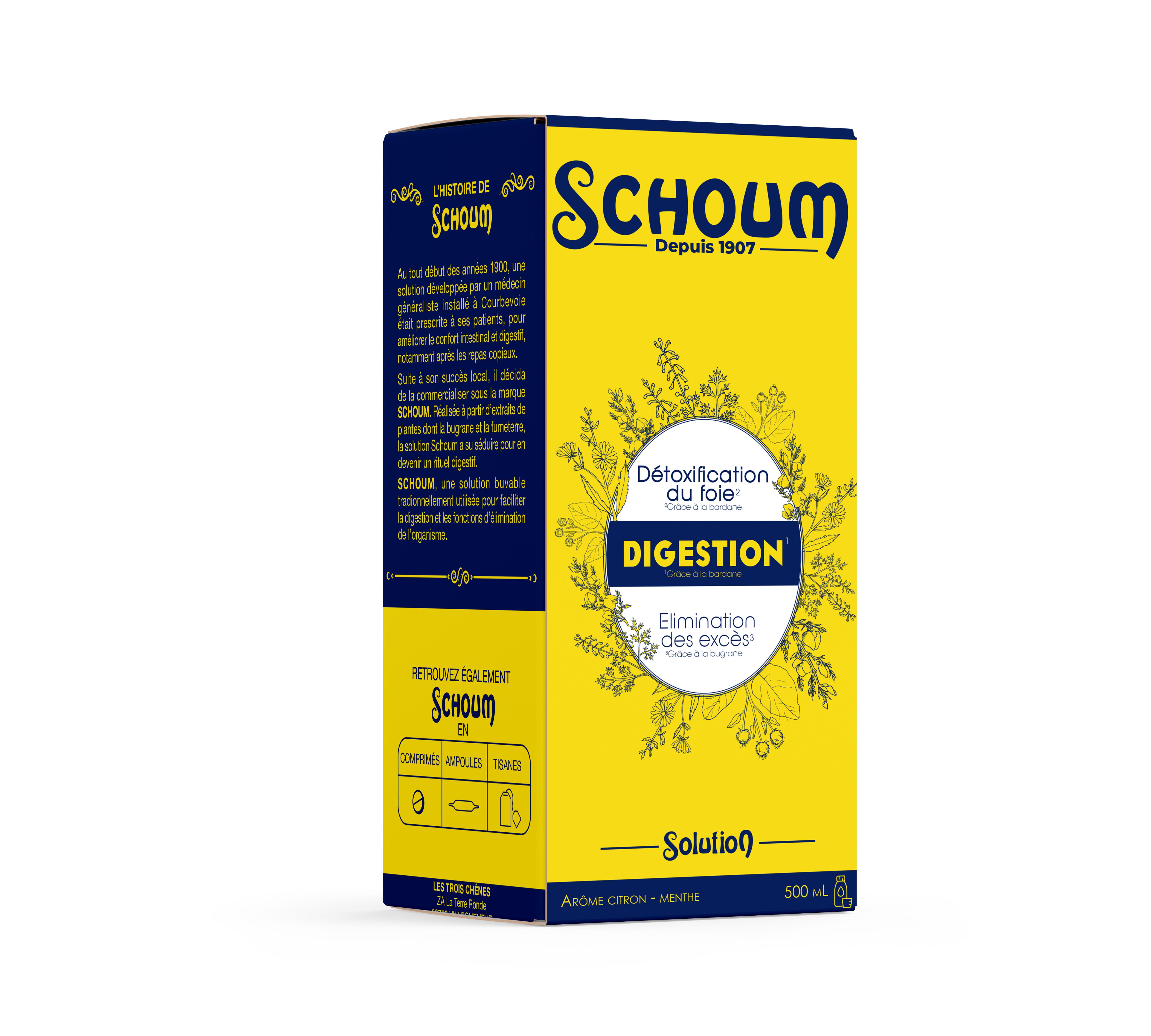Au tout début des années 1900, une solution développée par un médecin généraliste installé à Courbevoie était prescrite à ses patients, pour améliorer le confort intestinal et digestif, notamment après les repas copieux. Suite à son succès local, il décida de la commercialiser sous la marque SCHOUM. Réalisée à partir d’extraits de plantes dont la bugrane et la fumeterre, la solution Schoum a su séduire pour en devenir un rituel digestif. SCHOUM, une solution buvable tradionnellement utilisée pour faciliter la digestion et les fonctions d’élimination de l’organisme