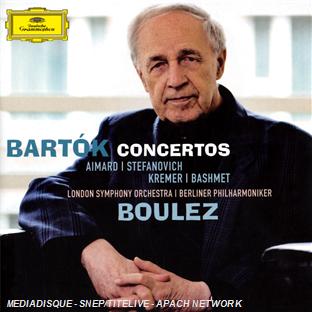 Pierre Boulez Aimard . Stefanovich . Kremer . Bashmet Berliner Philharmoniker . London Symphony Orchestra Concerto pour alto . Concerto pour violon . Concerto pour 2 pianos, percussion, et orchestre Pierre Boulez est un chef de légende. Avec ce nouvel album, il conclue son projet dédié à l'enregistrement des Concertos de Bartok - plébiscité par la presse. Cet album nous propose le Concerto pour alto, le Concerto pour violon n°1 et le Concerto pour 2 pianos, percussion et orchestre. Pour ce projet, Pierre Boulez s'est entouré des plus grands spécialistes de ce répertoire : Yuri Bashmet à l'alto, Gidon Kremer au violon, Pierre-Laurent Aimard au piano ; il dirige deux orchestres parmi les meilleurs du monde : le Philharmonique de Berlin et le London Symphony Orchestra. Pierre-Laurent Aimard est un partenaire de longue date de Pierre Boulez, l'alchimie entre ces deux artistes fonctionne à merveille.