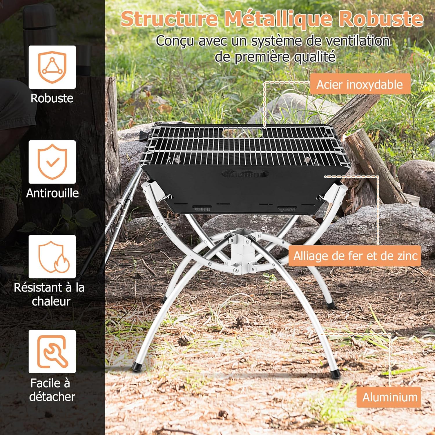 - Matériau de qualité supérieure pour la durabilité : Le corps du brasero de camping dispose d'une structure à 3 niveaux, comprenant des grilles en acier inoxydable 304, un panneau en alliage de zinc et de fer et des pieds de support en aluminium, résistants à la chaleur et antirouille pour une utilisation à long terme. Des connexions serrées et des repose-pieds antidérapants assurent également une stabilité accrue.