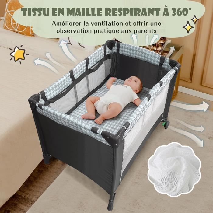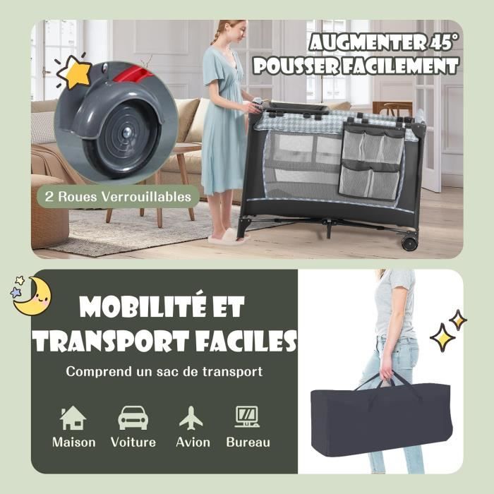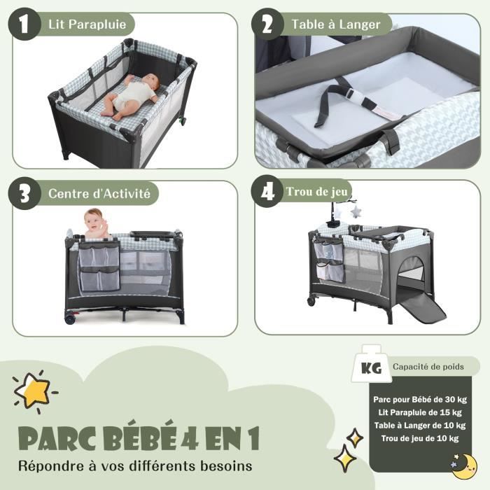 ’-Design multifonctionnel 3 en 1: table à langer, lit bébé, et parc de jeux. -Barre de jouets tournante avec boîte à musique pour une interaction avec bébé. -Table à langer amovible avec ceinture de sécurité assure la sécurité de votre bébé. -Sac de rangement peut stocker des couches, des biberons et d'autres choses.Matelas épaissis pour un sommeil confortable.