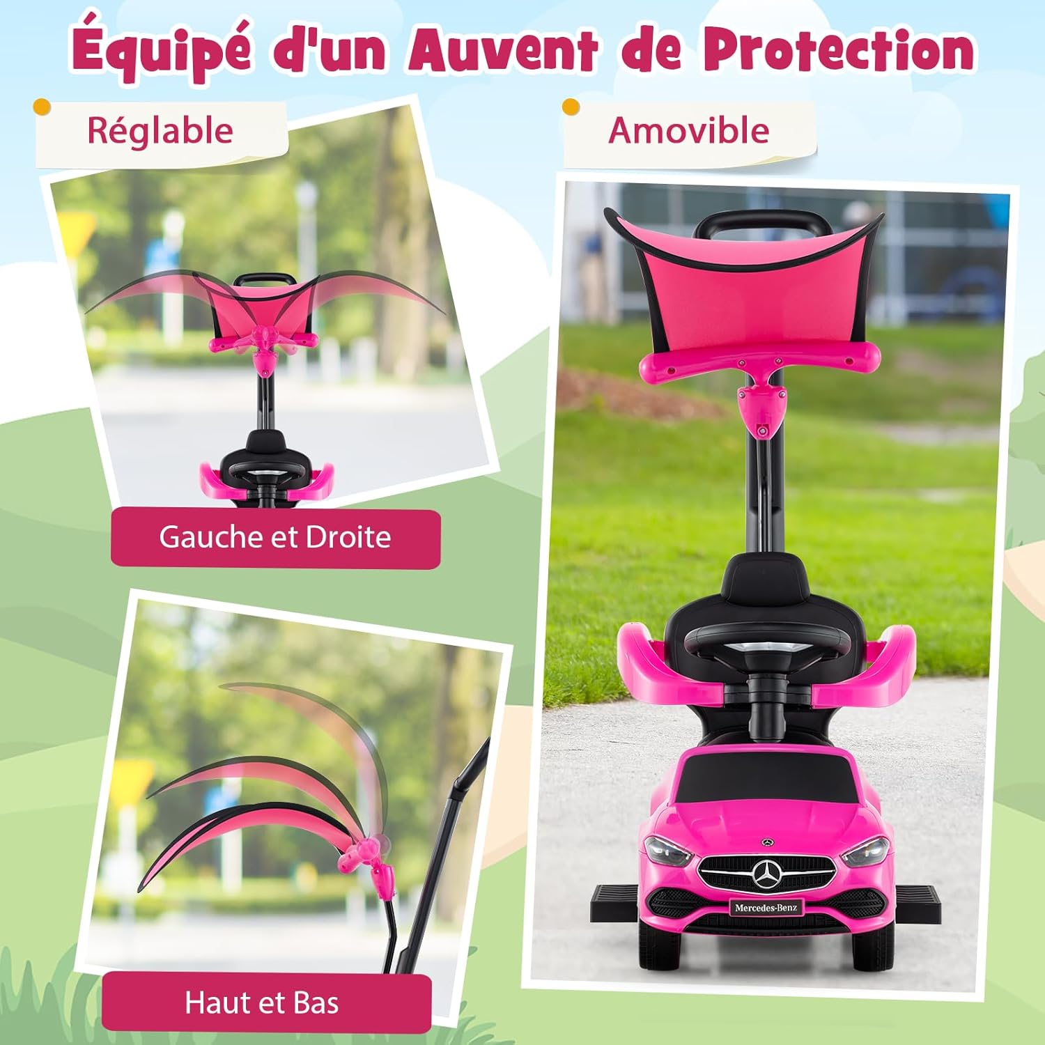 3 en 1 porteur bebe mercedes-benz pour tout-petits, voiture à pousser avecauvent réglable, rangement,rose