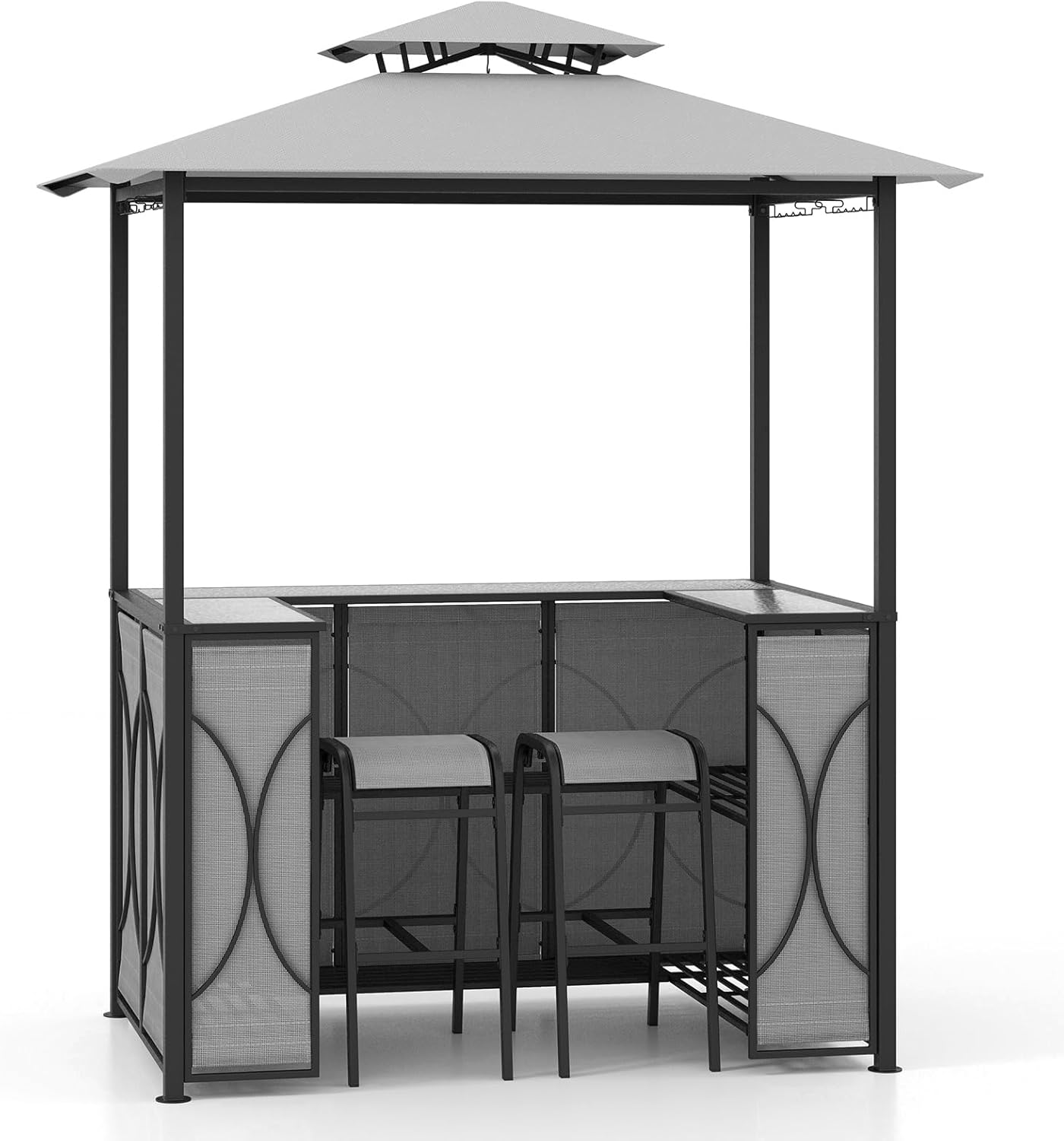 3 pcs abri barbecue avec bar d'extérieur,table de bar en verre trempé, 2 tabourets, porte-verres