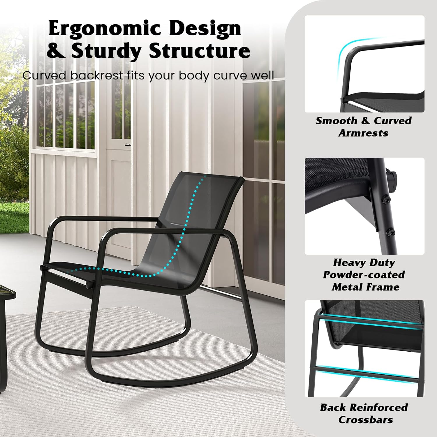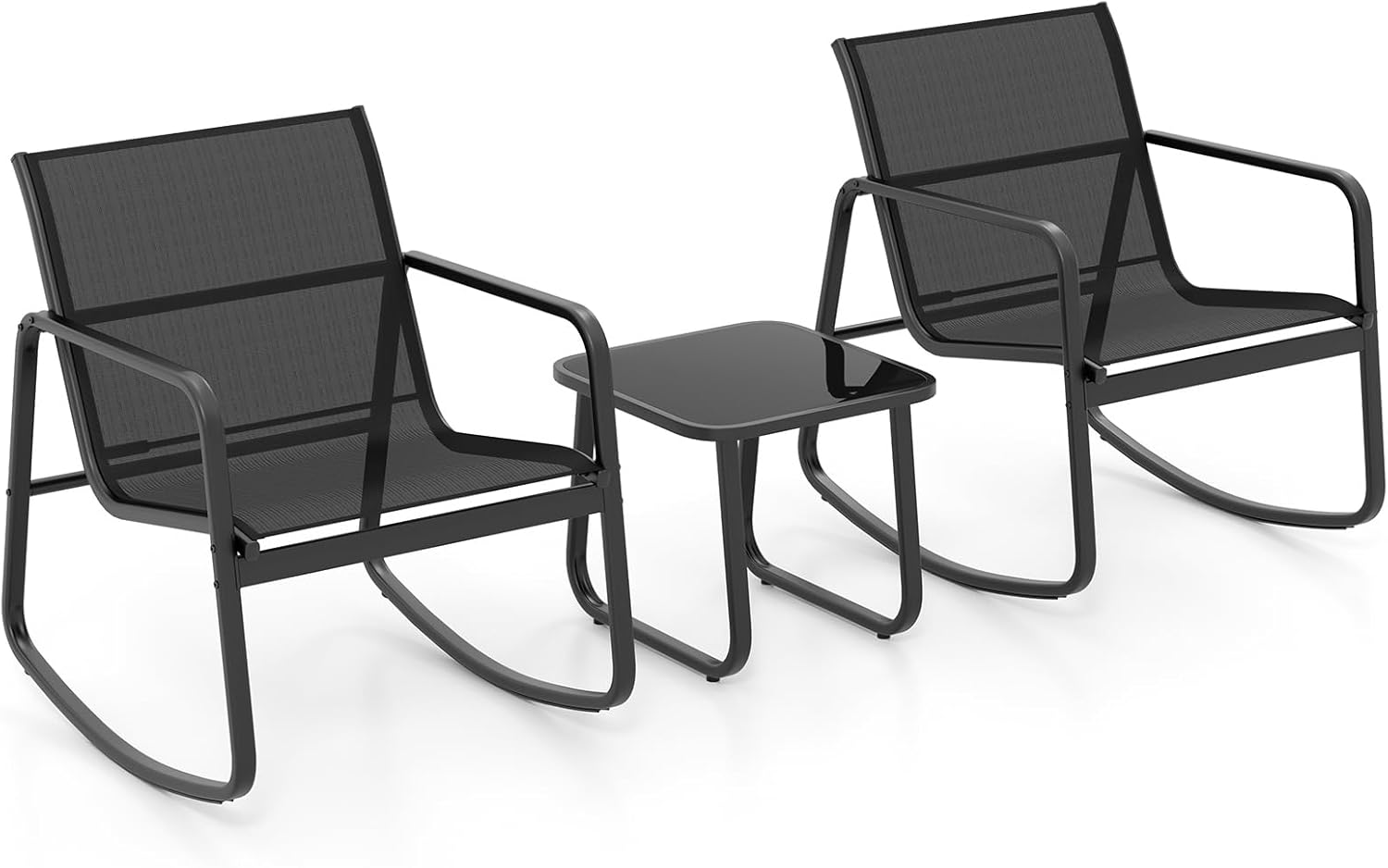 3 pcs ensemble de patio table et chaise de jardin, 2 chaises à bascule avec table basse en verre