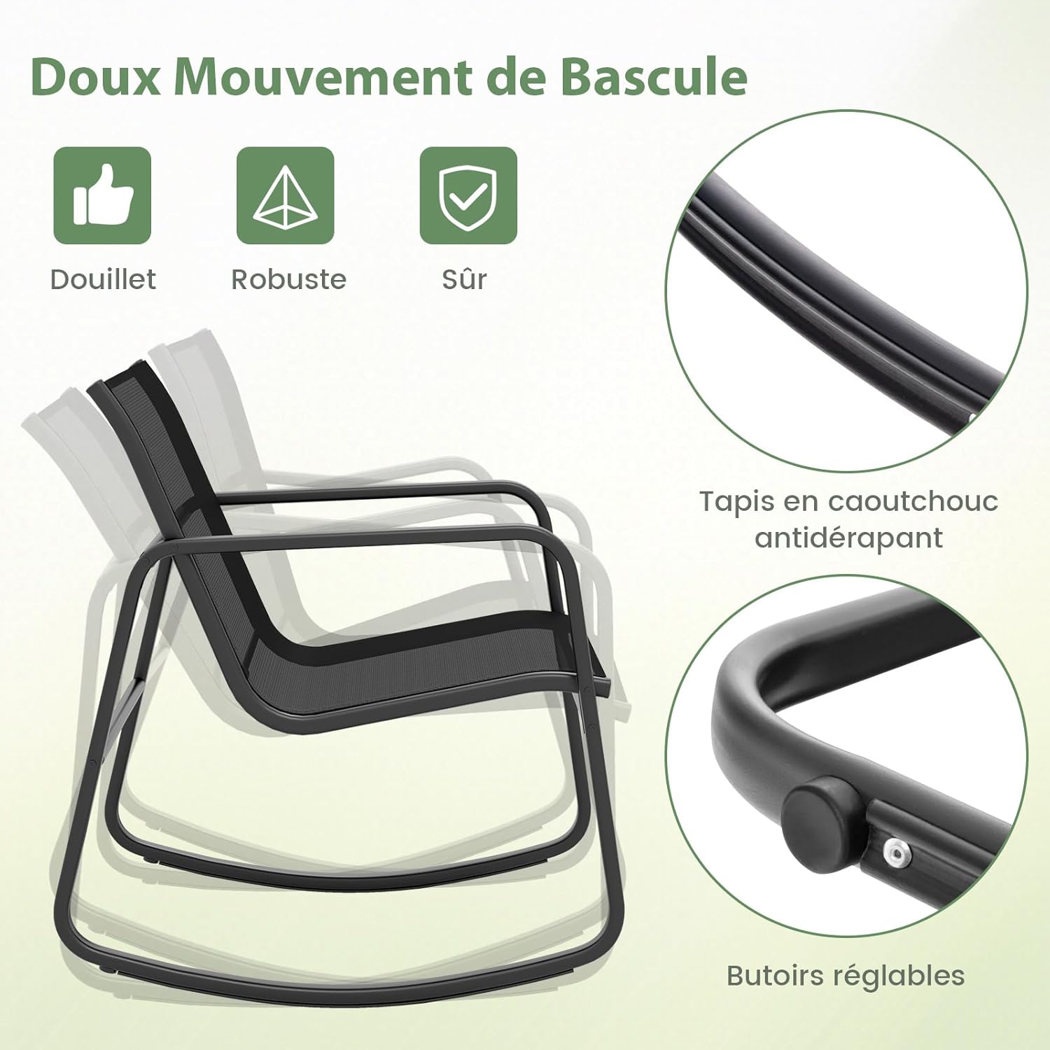 - Multiples occasions : Cet ensemble minimaliste et élégant composé de deux fauteuils à bascule et d'une table basse ne se limite pas à un espace spécifique. Il est idéal pour les balcons, les patios, les jardins et même les piscines