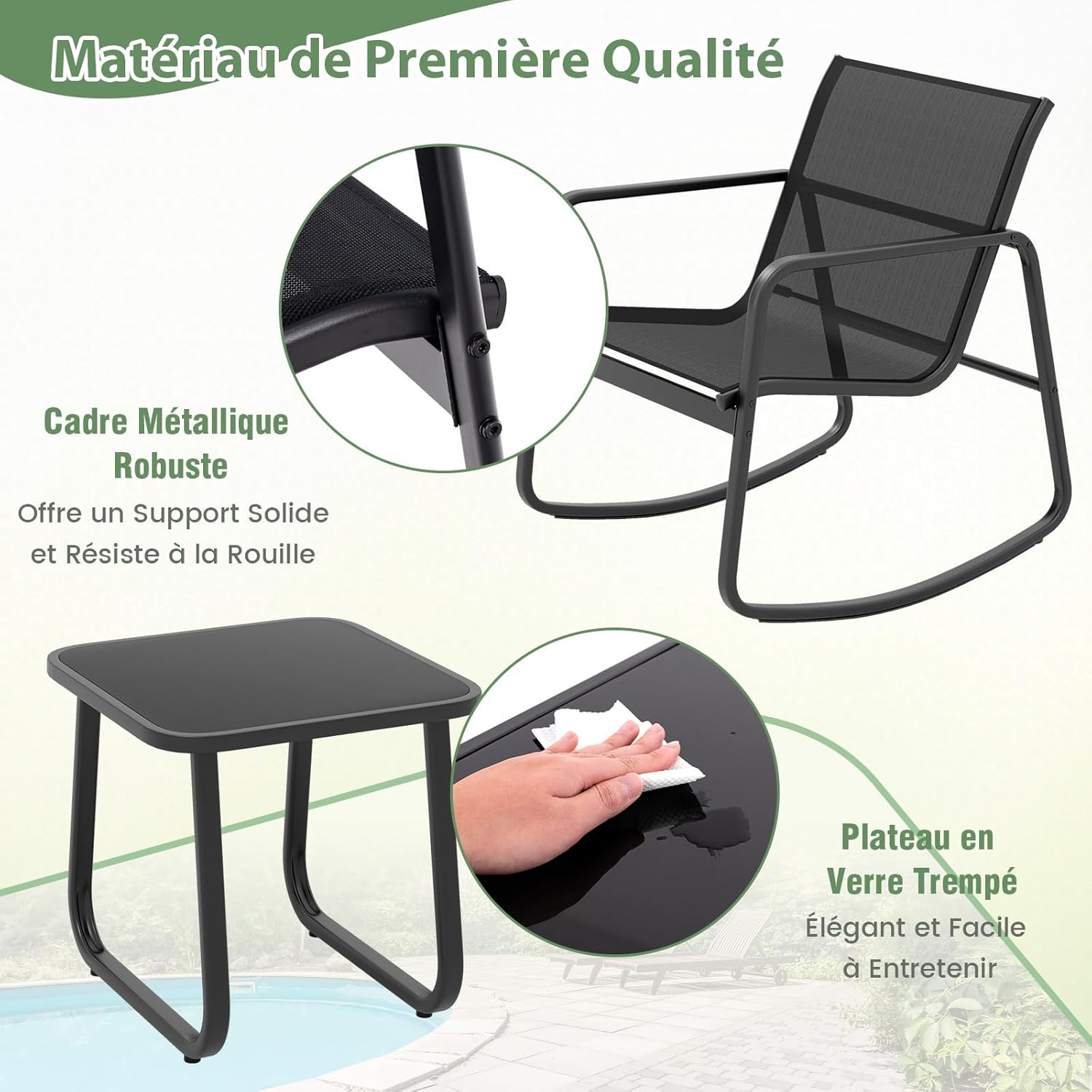 | Libellé | 3 pcs ensemble de patio table et chaise de jardin, 2 chaises à bascule avec table basse en verre |