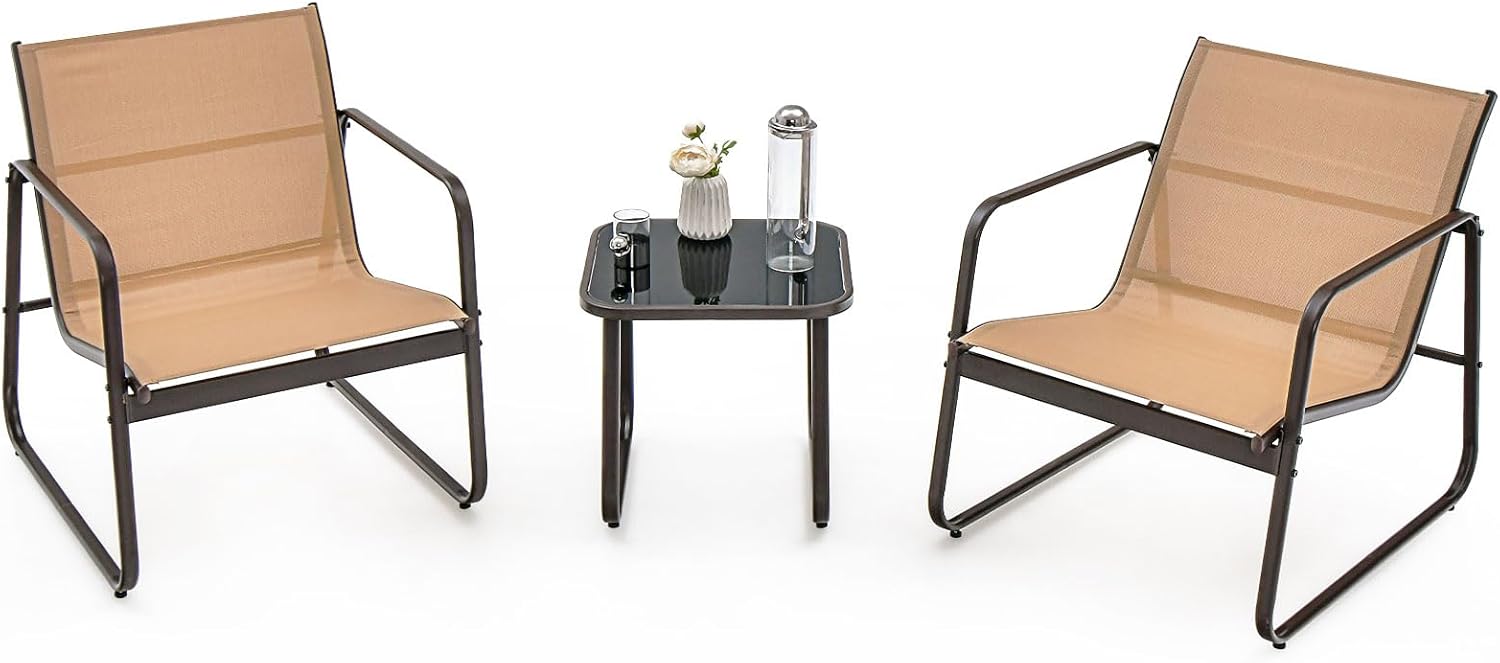 3 pcs salon de jardin 3 personnes, ensemble 2 chaises et table basse en verre trempé, cadre métallique