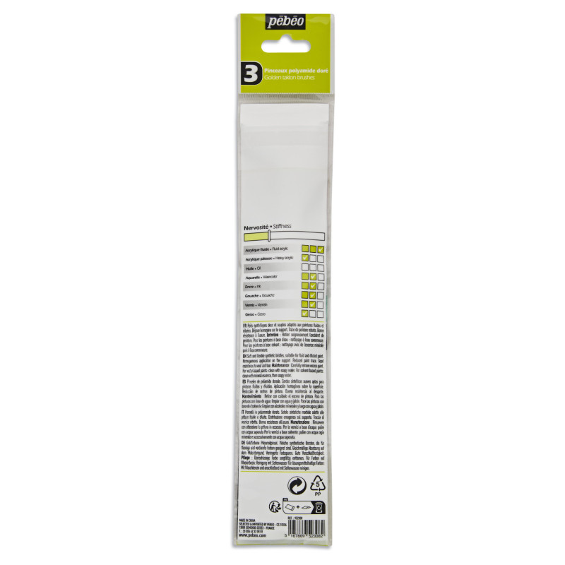 | Libellé | 3 pinceaux - Plat - Acrylique fluide - N°4 N°10 N°18 - Manche court - Pébéo |