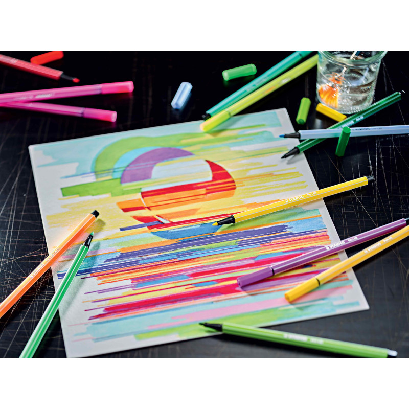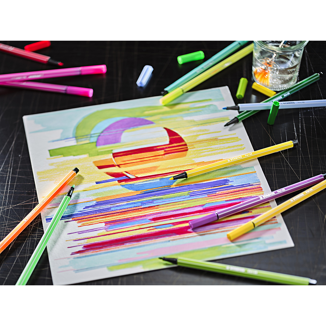 Fabriqué par STABILO en Europe et issu du savoir-faire Beaux-Arts de la marque, le feutre de dessin STABILO Pen 68 est une référence du coloriage depuis 1966. Il est doté d’une pointe ogive moyenne d’1 mm et son encre inodore à base d’eau se décline en 65 couleurs lumineuses et intenses. Polyvalent, le feutre STABILO Pen 68 est parfait pour dessiner, colorier, remplir de grands aplats de couleurs, créer des effets d'aquarelle ou réaliser des mandalas. Il sera l'allié de toutes vos créations, à l'école ou à la maison, pour un usage amateur ou professionnel. Grâce à un procédé anti-dessèchement, STABILO Pen 68 peut rester ouvert jusqu’à 24 heures sans sécher sans avoir à remettre le capuchon : parfait pour créer sans aucune limite !