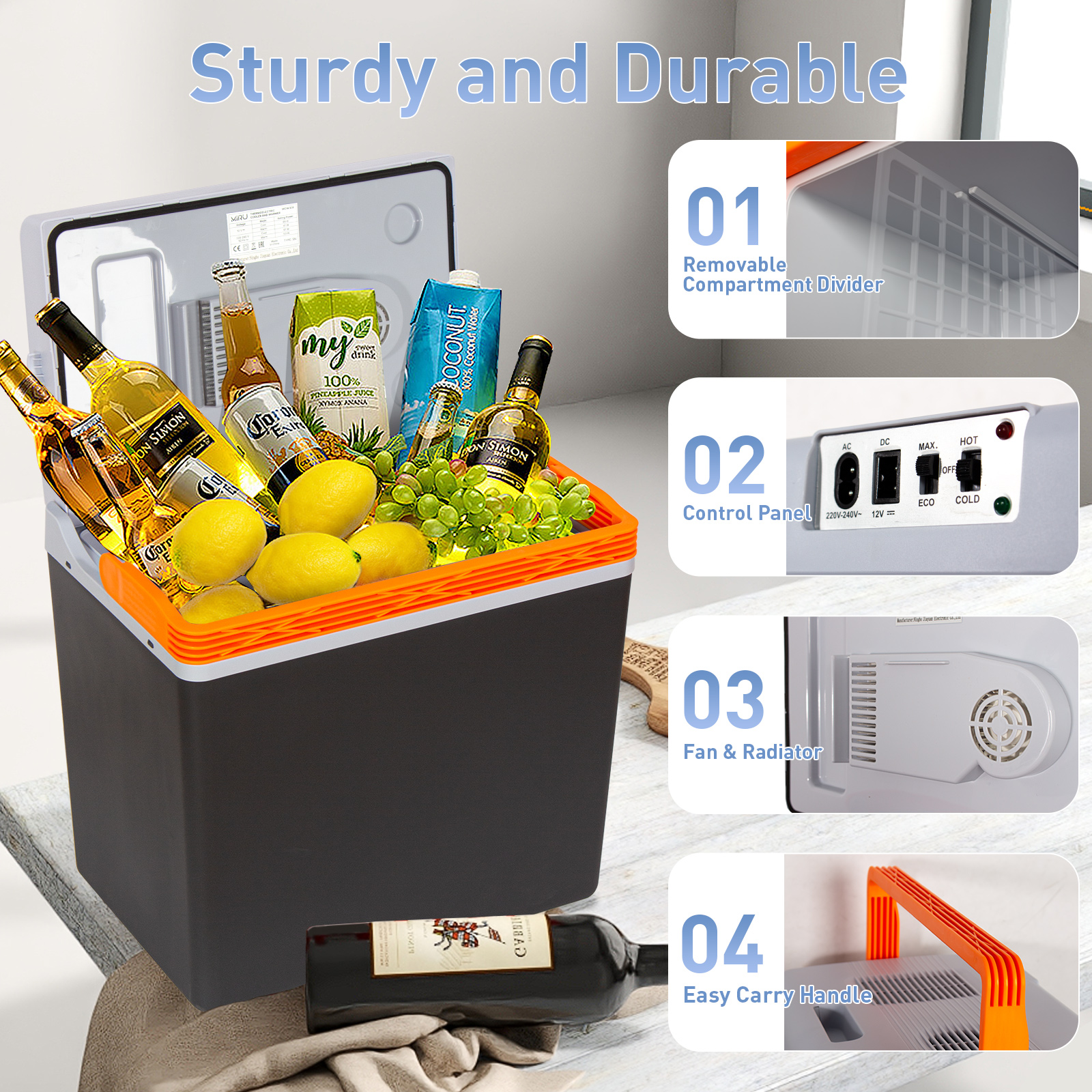 Utilisation pratique en voiture : Intégrez facilement le refroidisseur dans votre voiture via le câble de connexion 12V fourni, compatible avec les allume-cigarettes standard. De plus, l'inclusion d'un câble de connexion 220V-240V répond à une utilisation domestique, adapté aux prises européennes traditionnelles.