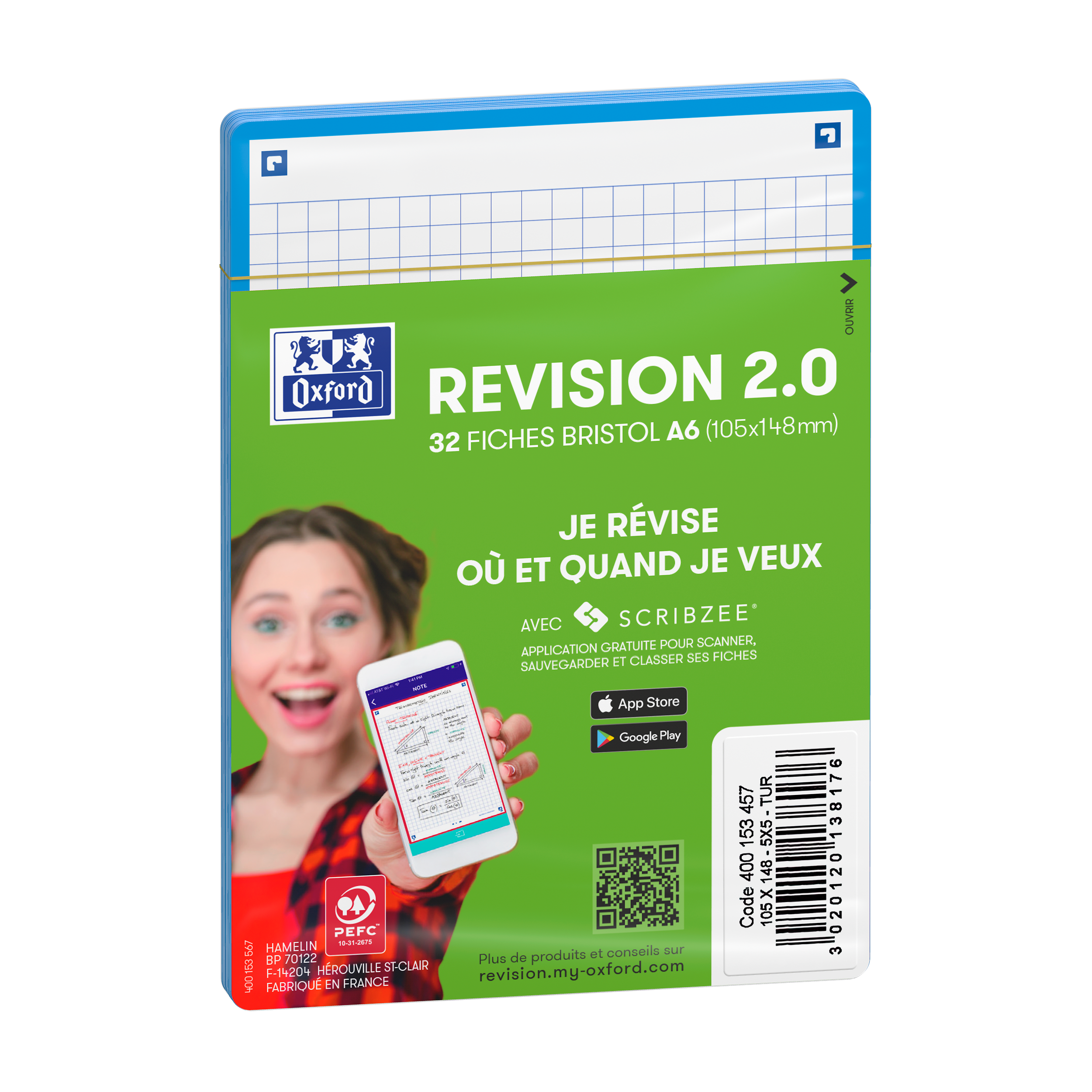 | Libellé | 32 Fiches Bristol REVISION 2.0 OXFORD A6 - Petits carreaux - Cadre TURQUOISE - Non perforé - s/film |