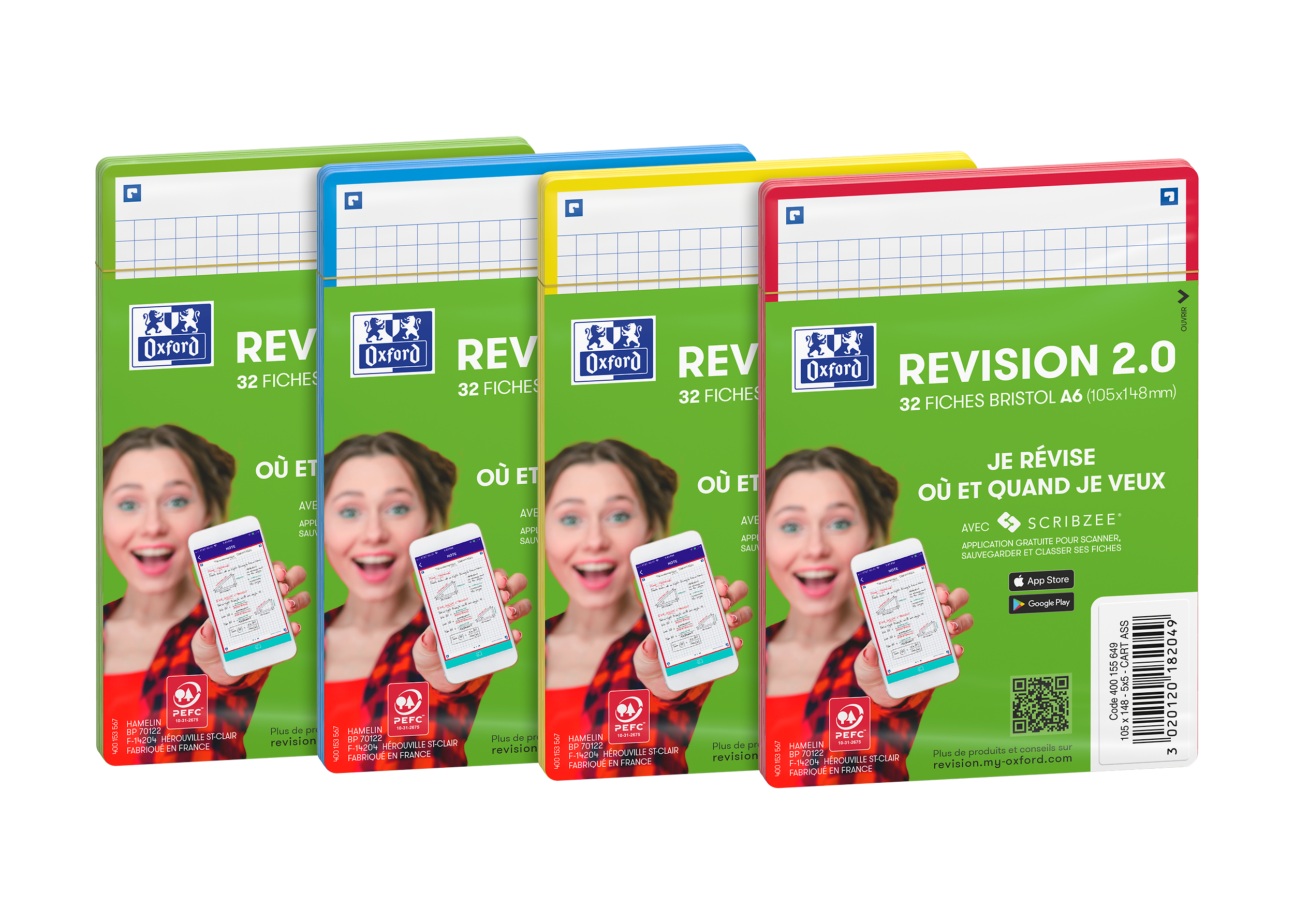 Avec les fiches REVISION 2.0, préparez sereinement vos examens en révisant où et quand vous voulez ! Profitez du temps passé dans les transports ou pendant vos pauses pour réviser et être au top au moment des examens. Vous avez oublié vos fiches à la maison? Vous n'avez pas envie d'avoir à les transporter ni de prendre le risque de les perdre ? Pas de stress, avec l’application Scribzee® vos fiches sont sauvegardées dans le cloud gratuitement. Elles sont disponibles à tout moment pour réviser partout et depuis tous vos appareils connectés. Et grâce à Scribzee® vous pourrez même suivre l’avancement de vos révisions au jour le jour ! Enfin, leur cadre de couleur va non seulement apporter un peu de fun à vos révisions mais aussi vous permettre de vous organiser efficacement par thème ou matière. Fini les longues heures passées à rechercher et à trier vos fiches, vos fiches REVISION 2.0 sont toutes regroupées et classées dans Scribzee® ! Ces fiches sont proposées en packs de 32 fiches, format A6, réglure petits carreaux et cadre de couleur. Des packs de 4 variantes monocouleurs différentes (packs cadre rouge, turquoise, vert et jaune) composent l'assortiment carton.