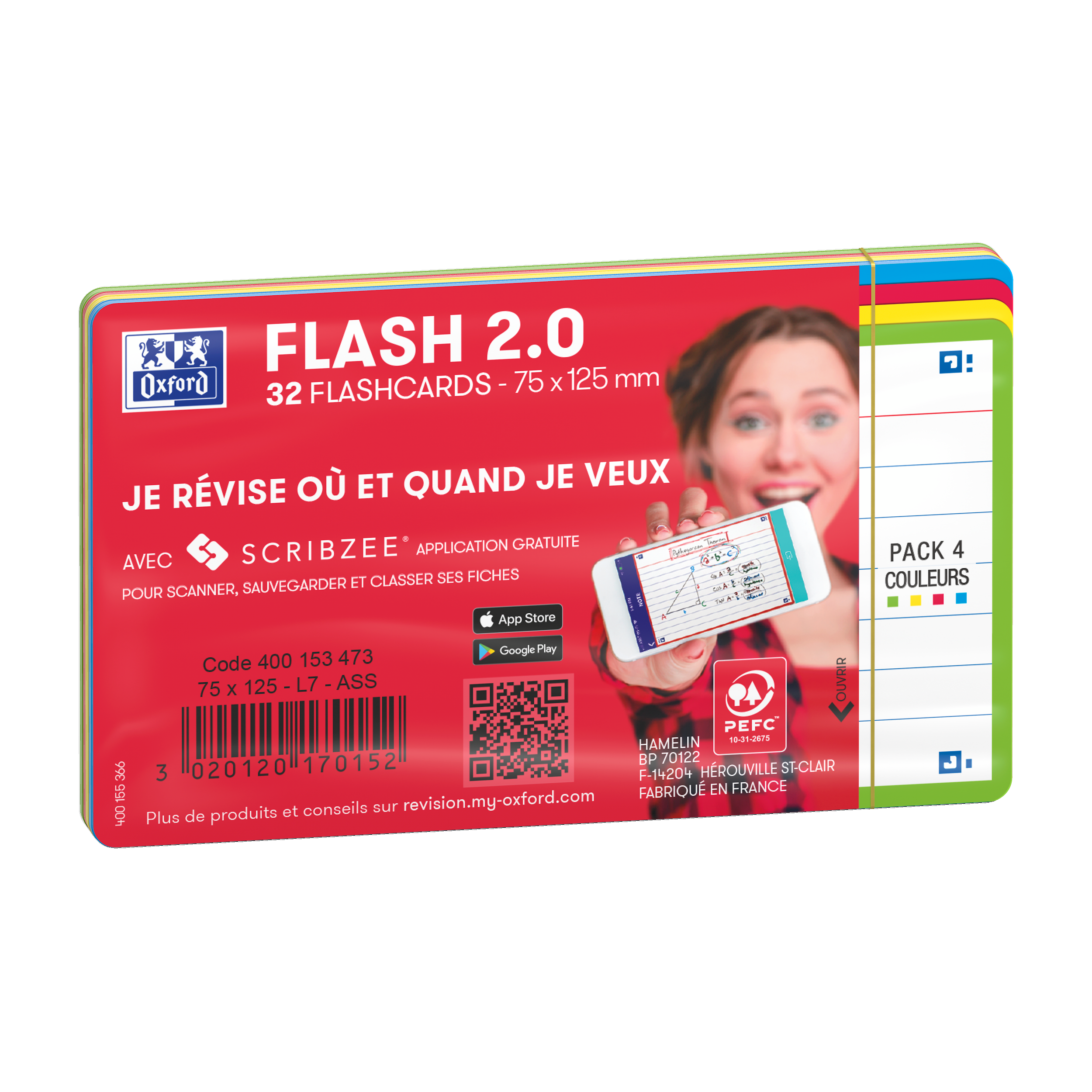 32 flashcards FLASH 2.0 OXFORD 7,5 x 12,5 cm - Ligné - 4 COULEURS de cadres ASSORTIES - Non perforé - s/f